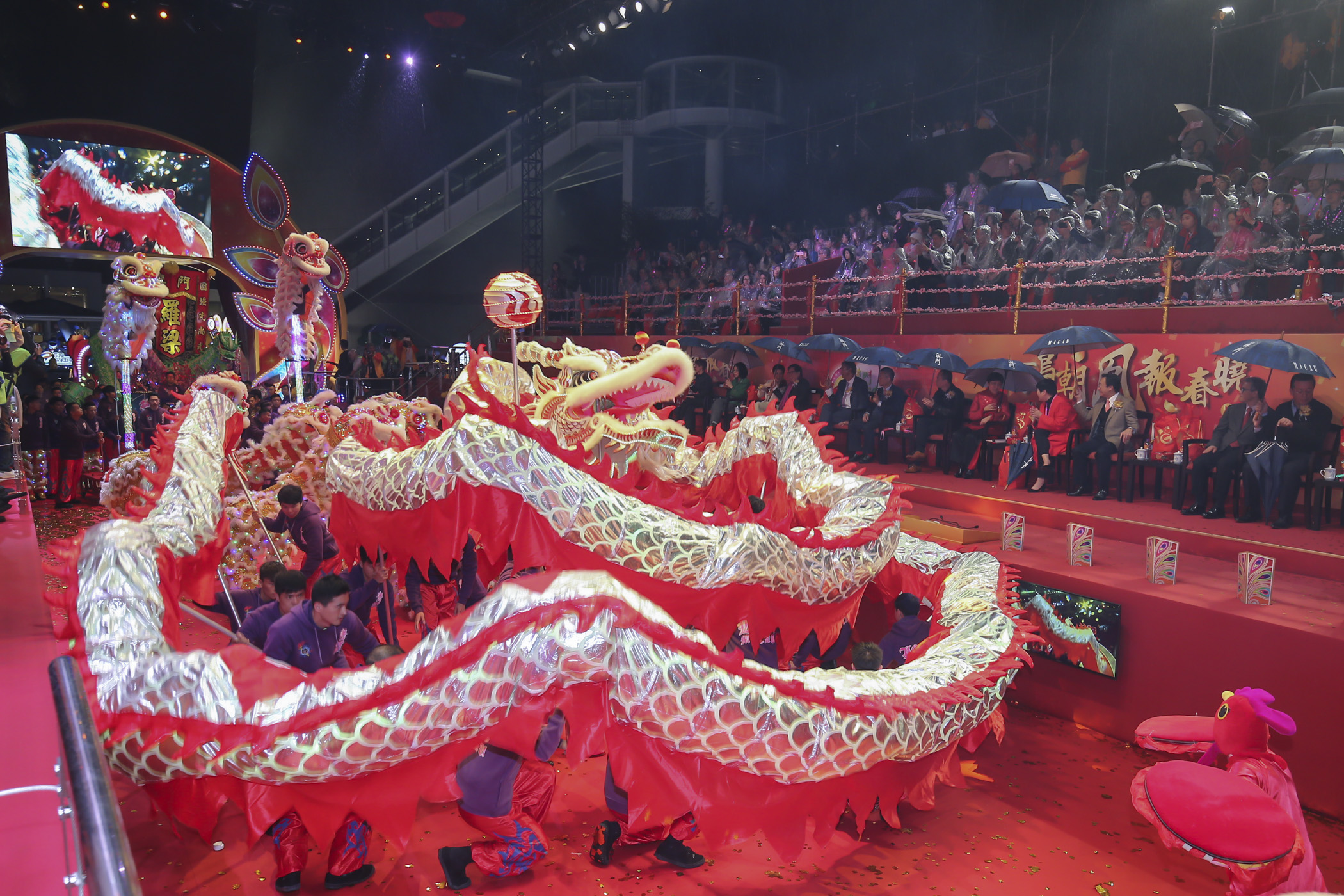 O Secretário para os Assuntos Sociais e Cultura (SASC), Alexis Tam, o chefe do Gabinete do SASC, Ip Peng Kin, a directora da Direcção dos Serviços do Turismo (DST), Maria Helena de Senna Fernandes, o presidente do Conselho de Administração do Instituto para os Assuntos Cívicos e Municipais, José Tavares, o presidente do Instituto Cultural, Ung Vai Meng, o chefe do Departamento de Administração de Instalações Desportivas do Instituto do Desporto, Ho Wa, e o director do Centro de Intercâmbio de Turismo da Ásia em Hong Kong da Administração do Turismo da China, Li Jianping, entre outros convidados, presidiram à cerimónia de arranque da Parada de Celebração do Ano do Galo, realizada às 20h00, em frente ao Centro de Ciência de Macau, dando assim o início a este evento do Ano Novo Lunar. A ocasião foi animada pelos apresentadores de programas de televisão de Hong Kong, Bob Lam e Sarika Choy, a par actuações de dança de fénix e do grupo de Hong Kong, C AllStar. Em seguida, os 14 carros alegóricos, acompanhados de 688 animadores artísticos partiram do ponto de arranque, caminhando em conjunto com o público para um ano mais brilhante.