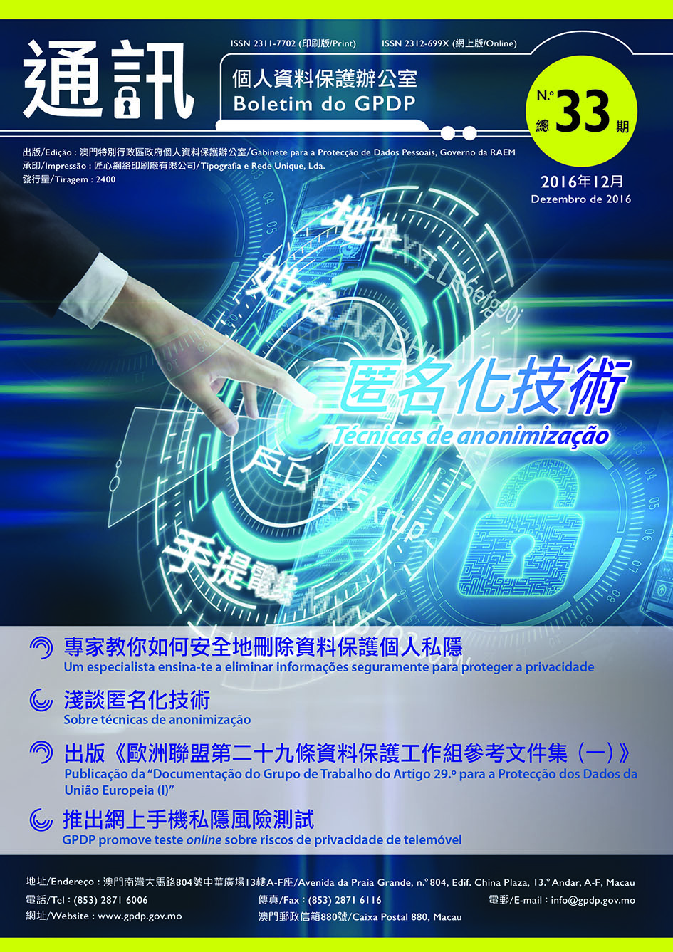 Depois de atingir os fins do tratamento inicial ou na sequência do tratamento de dados, o responsável pelo tratamento deve eliminar esses dados até ao termo do prazo de conservação, para reduzir os riscos de violação de informações. No entanto, hoje em dia, com o desenvolvimento rápido das tecnologias, nomeadamente, o amadurecimento e a generalização de técnicas de recuperação de dados, é muito importante ter conhecimentos sobre a protecção de dados, incluindo a eliminação completa dos dados pessoais sensíveis conservados em dispositivos de armazenamento. Nesta edição, convidámos o engenheiro Tai Kin Ip, do Departamento de Sistemas de Informação do CPTTM para apresentar os métodos seguros da destruição de informações. Para além disso, para atender às necessidades acrescidas de “dados abertos” com grande procura na sociedade, em vários países e regiões começou-se a discutir a possibilidade de reutilização de informações e, actualmente, as técnicas de anonimização são consideradas como uma boa estratégia para manter os benefícios de conservação de dados e atenuar os riscos. No intuito de permitir à população em geral ter noções básicas da respectiva matéria, consta nesta nova edição um texto sobre as técnicas em causa. Ademais, são publicadas neste Boletim novidades do GPDP, incluindo a sua participação em várias reuniões de organizações internacionais de privacidade, a publicação de uma documentação dos documentos e pareceres na área de protecção de dados da União Europeia e a promoção de um teste online sobre riscos de privacidade do telemóvel.