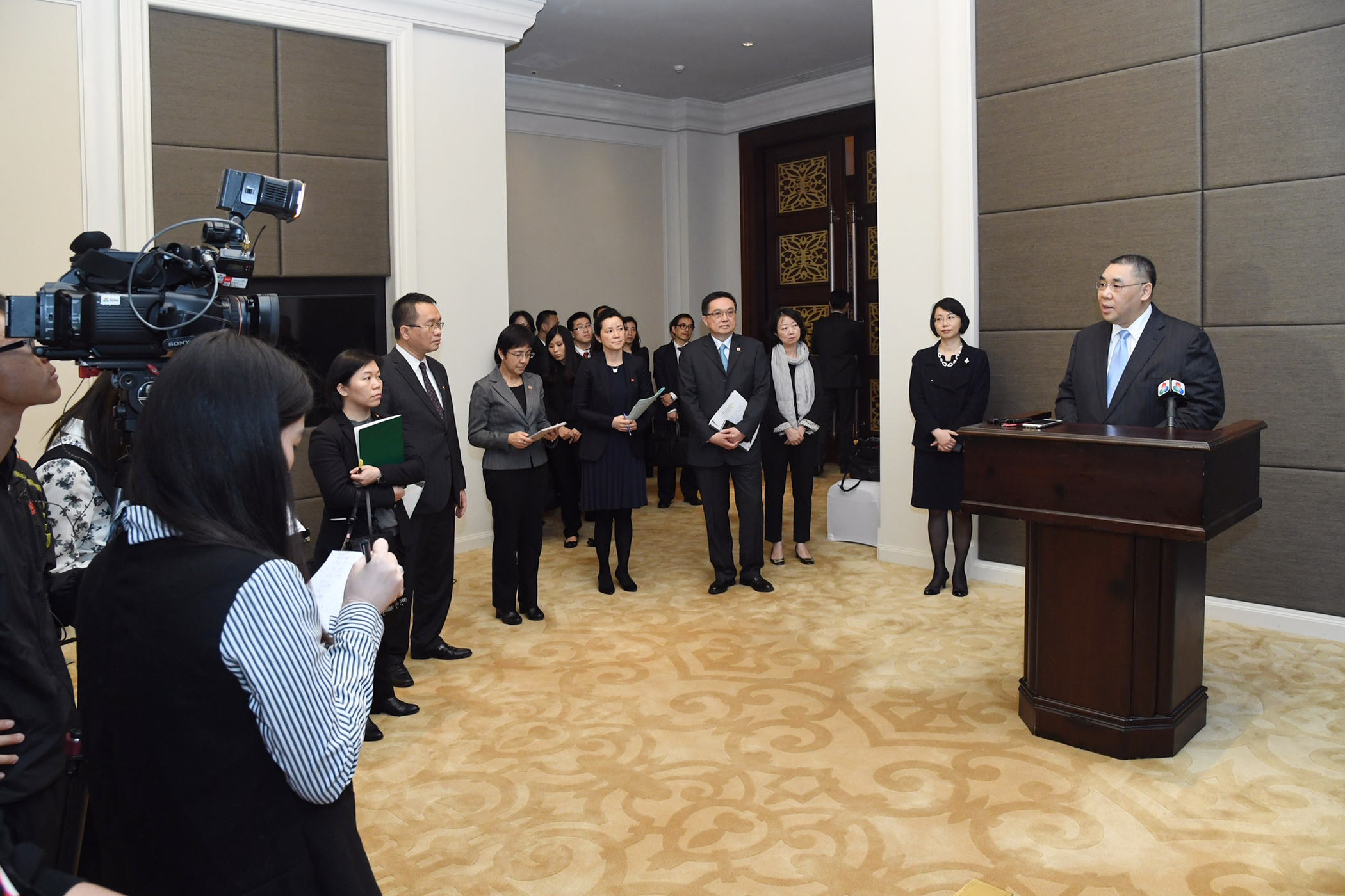 Após o encontro, o Chefe do Executivo, Chui Sai On, o presidente do Instituto de Promoção do Comércio e do Investimento de Macau, Jackson Chang, a directora dos Serviços de Turismo, Helena de Senna Fernandes, a presidente do Conselho de Administração da Macau Investimento e Desenvolvimento S. A., Lu Hong, fizeram um balanço à comunicação social.