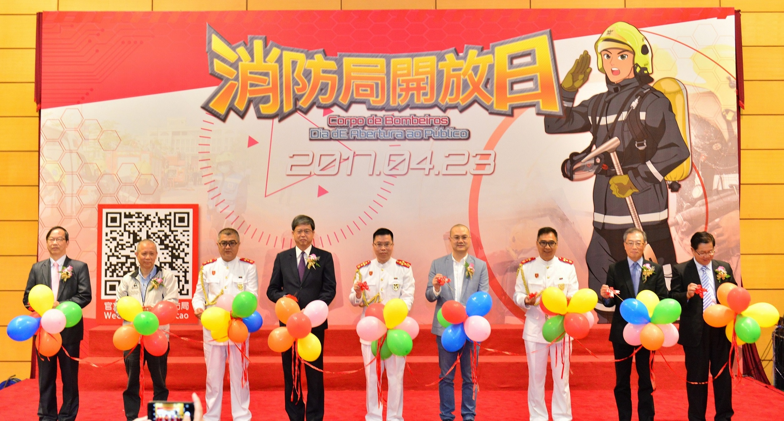 A cerimónia de inauguração do Dia de Abertura ao Público do Corpo de Bombeiros foi presidida pelo Comandante do CB, chefe-mor Leong Iok Sam. Os representantes de várias associações e organizações de Macau também marcaram presença no evento (sem nenhuma ordem em particular): União Geral das Associações dos Moradores de Macau, Aliança de Povo de Instituição de Macau, Associação de Administração de Propriedades de Macau e Associação de Profissionais do Sector da Administração de Propriedades de Macau.