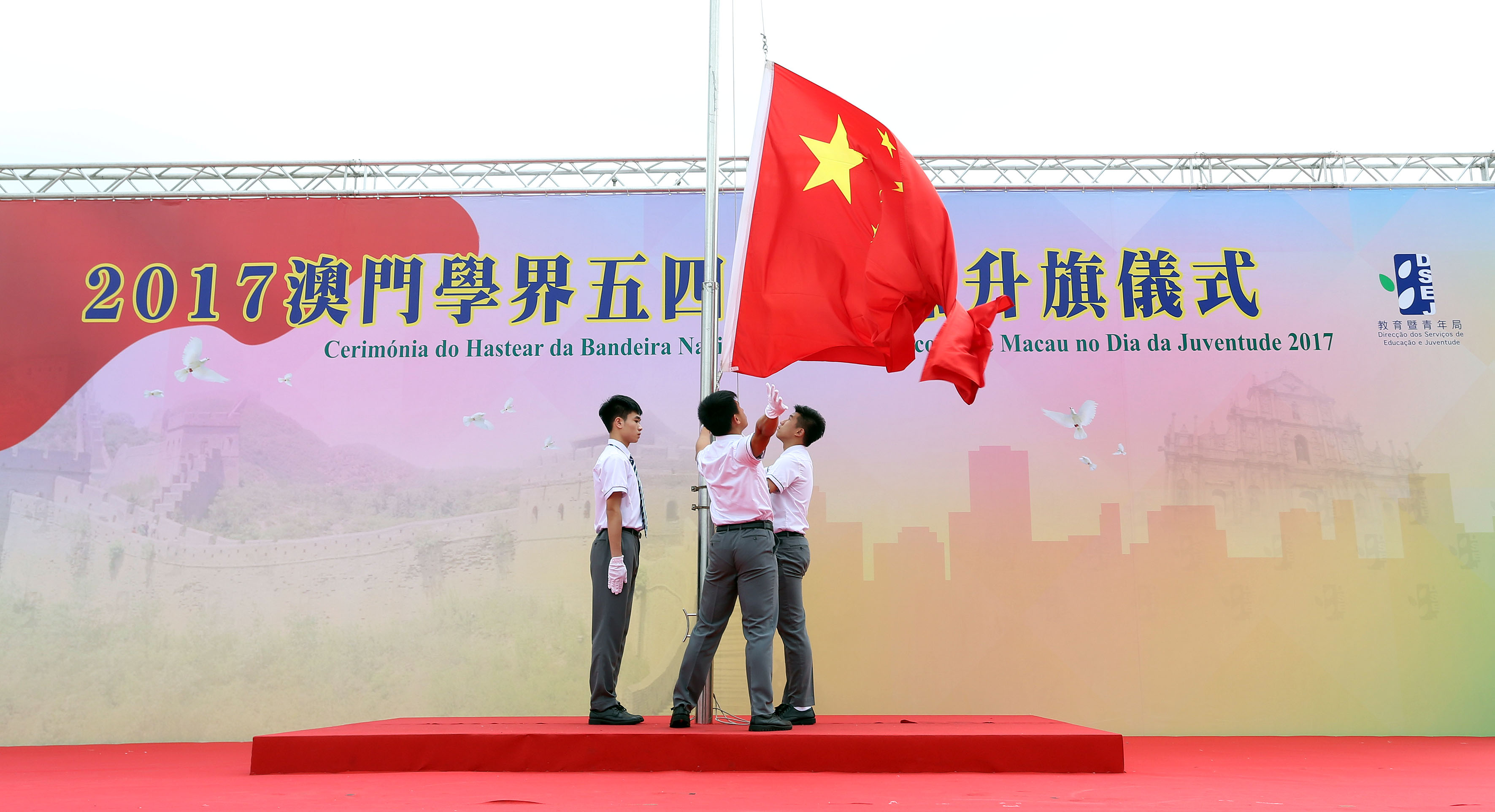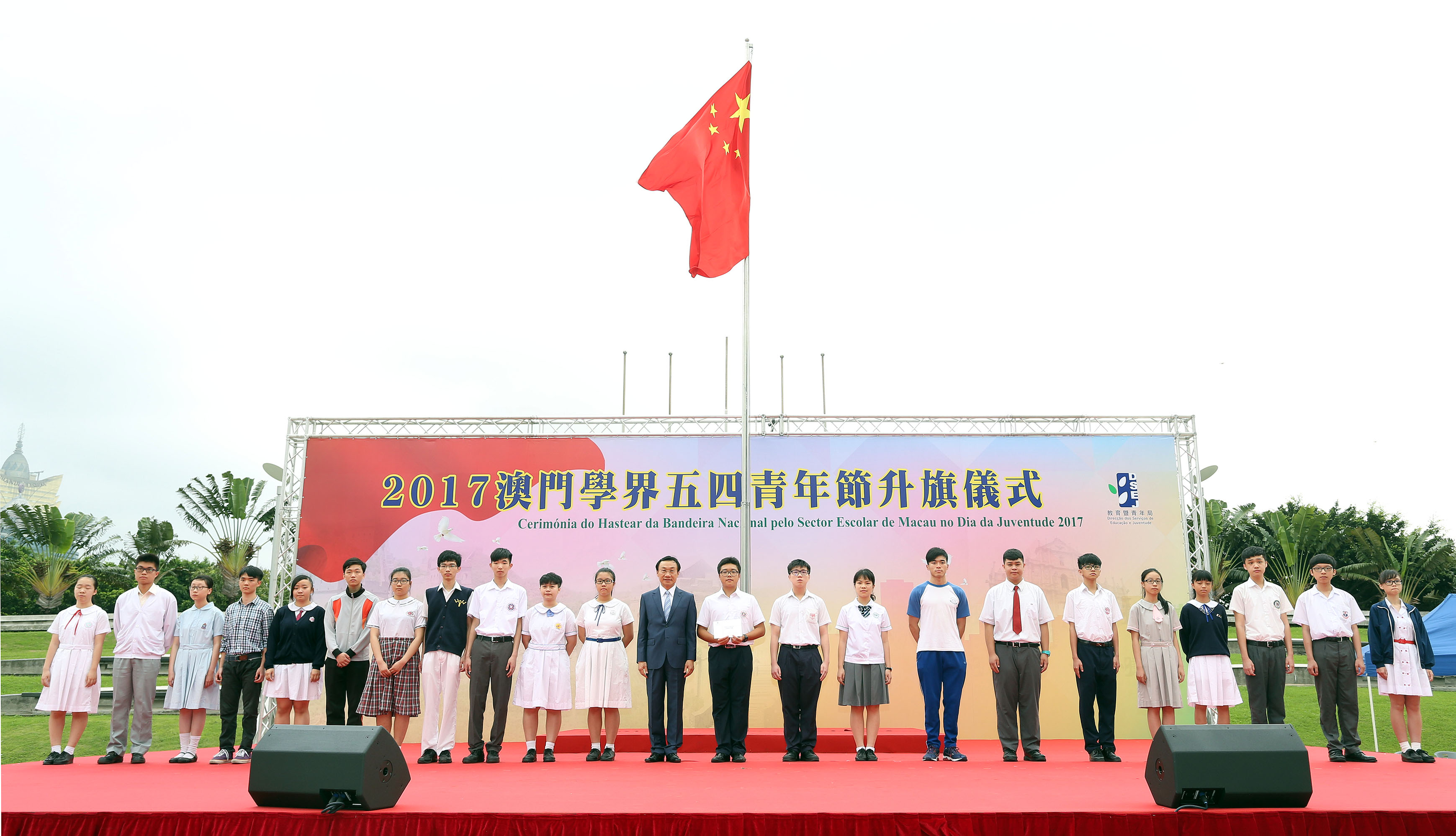 Para promover a educação do amor pela Pátria e por Macau e reforçar, nos alunos, o conhecimento do espírito e da história do Movimento do 4 de Maio, a Direcção dos Serviços de Educação e Juventude (DSEJ) organizou, na manhã do dia 4 de Maio, a “Cerimónia do hastear da Bandeira Nacional pelo sector escolar de Macau no Dia da Juventude”, na Praça do Lago Sai Van, que contou com a presença dos seguintes convidados: Secretário para os Assuntos Sociais e Cultura, Alexis, Tam Chon Weng, subdirector do Gabinete de Ligação do Governo Popular Central na Região Administrativa Especial de Macau (RAEM), Xue Xiaofeng, chefe do Gabinete do Secretário para os Assuntos Sociais e Cultura, Ip Peng Kin, a directora da DSEJ, Leong Lai, chefe do Departamento de Cultura e Educação do Gabinete de Ligação do Governo Popular Central na RAEM, Xu Ting, vice-inspector do Gabinete dos Assuntos de Hong Kong, Macau e Taiwan da Comissão Nacional dos Assuntos Étnicos da República Popular da China, Lan Hai Bin, director do Departamento de Diplomacia Pública e Informações do Comissariado do Ministério dos Negócios Estrangeiros da República Popular da China na RAEM, Zheng Xinyou, chefes das subunidades da DSEJ, membros do Conselho de Educação para o Ensino Não Superior, do Conselho de Juventude e do Conselho Profissional do Pessoal Docente, bem como representantes de 60 escolas e de 25 associações juvenis, num total superior a 1.300 pessoas.