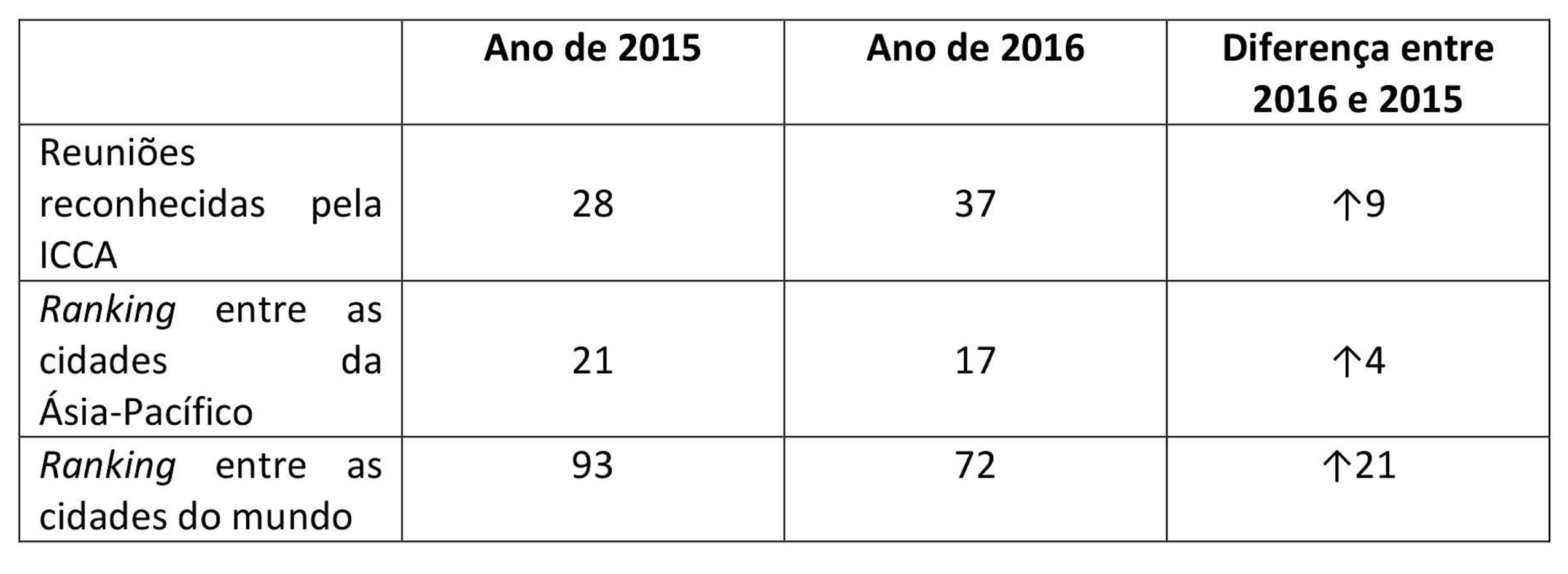 A Associação Internacional de Congressos e Convenções (ICCA, na sigla em inglês) publicou recentemente o seu relatório anual sobre a situação o mercado internacional de convenções de 2016 (2016 International Meetings Market Annual Report). De acordo com o referido relatório, Macau registou subidas em diversos indicadores, com resultados encorajadores, designadamente: no ranking entre as cidades do mundo, Macau subiu da 93.ª posição, registada em 2015, para 72.º lugar. No tocante ao ranking entre as cidades da Ásia-Pacífico, a RAEM melhorou também a sua posição, ocupando agora o 17.º lugar. Além disso, a ICCA reconheceu 37 convenções realizadas em Macau, sendo esse um número recorde.