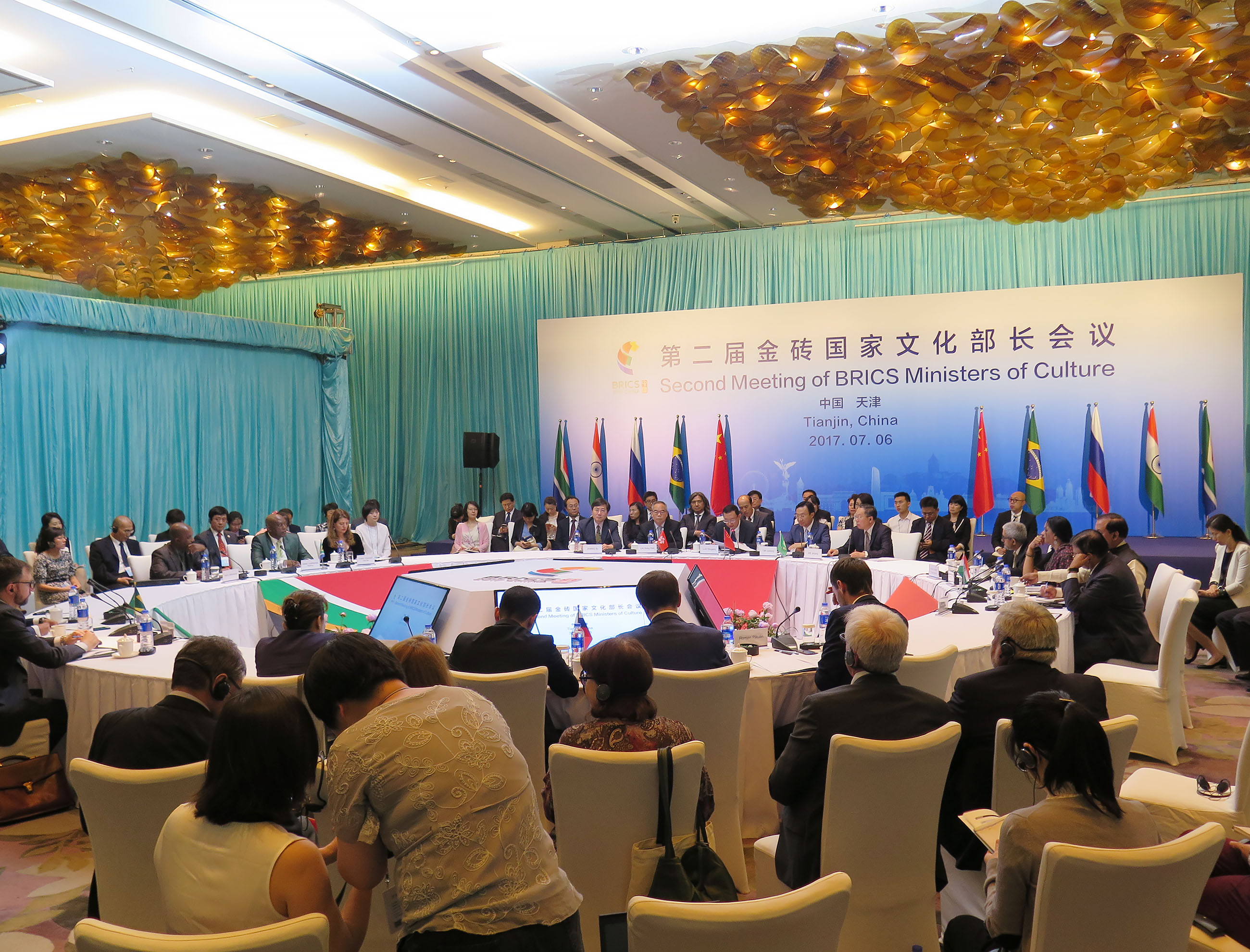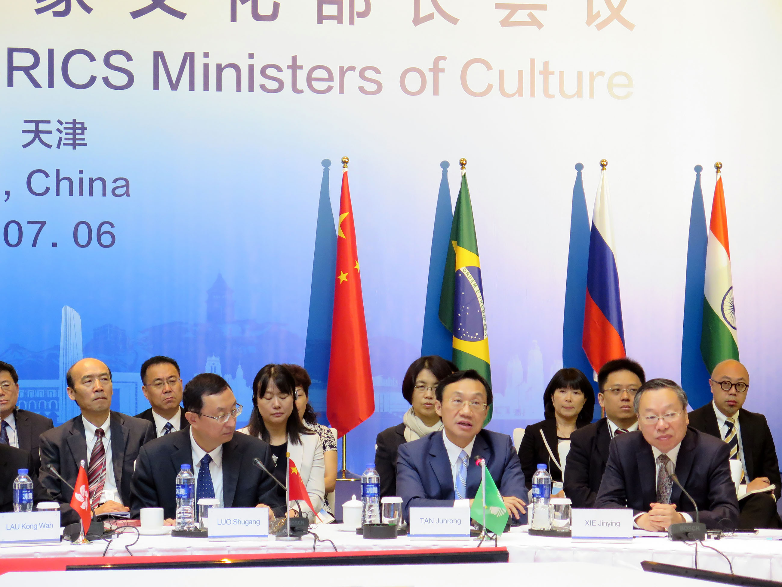 O Secretário para os Assuntos Sociais e Cultura, Alexis Tam, na qualidade de membro da delegação oficial da China, participou na 2.a Reunião dos Ministros da Cultura dos BRICS que teve lugar entre os dias 5 e 6 de Julho em Tianjin, presidida pelos ministros da cultura e representantes do BRICS, nomeadamente, Luo Shugang, Ministro da Cultura da China, Vladimir Medinskiy, Ministro da Cultura da Rússia, Mahesh Sharma, Ministro da Cultura da Índia, Adam Jayme Muniz, em representação do Ministro da Cultura do Brasil e Gerald Vusithemba Vusithemba Ndima, em representação do ministro nas áreas artísticas e culturais da África do Sul.