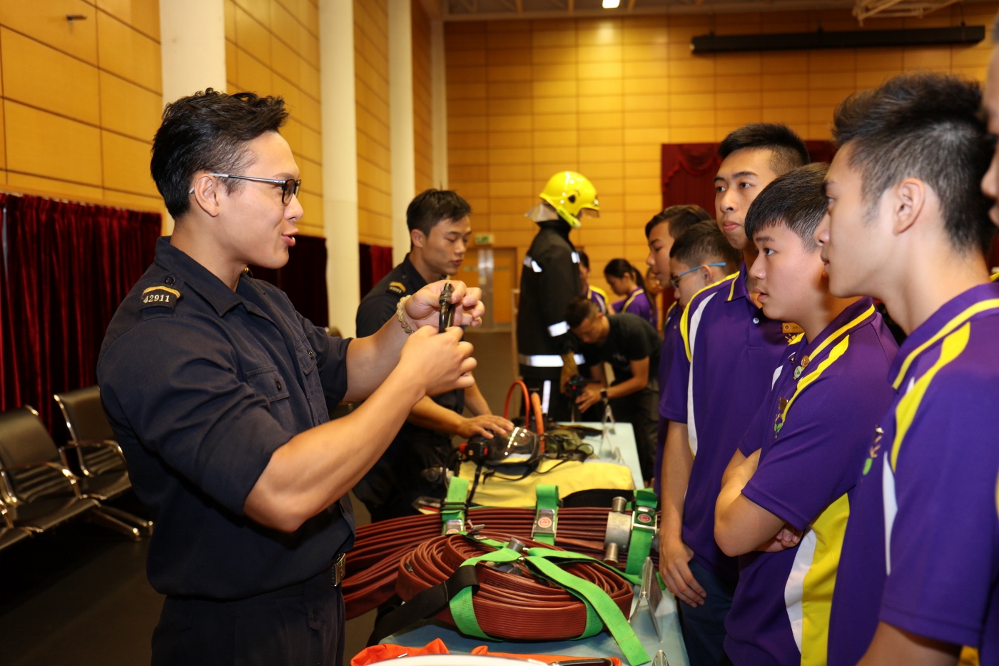 Com o objectivo de executar os três princípios do policiamento da área de segurança, designadamente : policiamento activo, policiamento comunitário e policiamento de proximidade, o Corpo de Bombeiros (CB) organizou hoje (dia 26 de Julho de 2017), actividade de experiência dedicada aos formandos do “Guia juvenil para combater o crime” da Polícia Judiciária, que teve lugar no Comando e Posto Operacional do Lago Sai Van do CB, para que os mesmos conseguissem inteirar-se mais dos nossos trabalhos através da visita e experimentação de tarefas dos bombeiros, a fim de fortalecer as suas consciências de segurança contra incêndios e os seus espíritos de serviço comunitário.