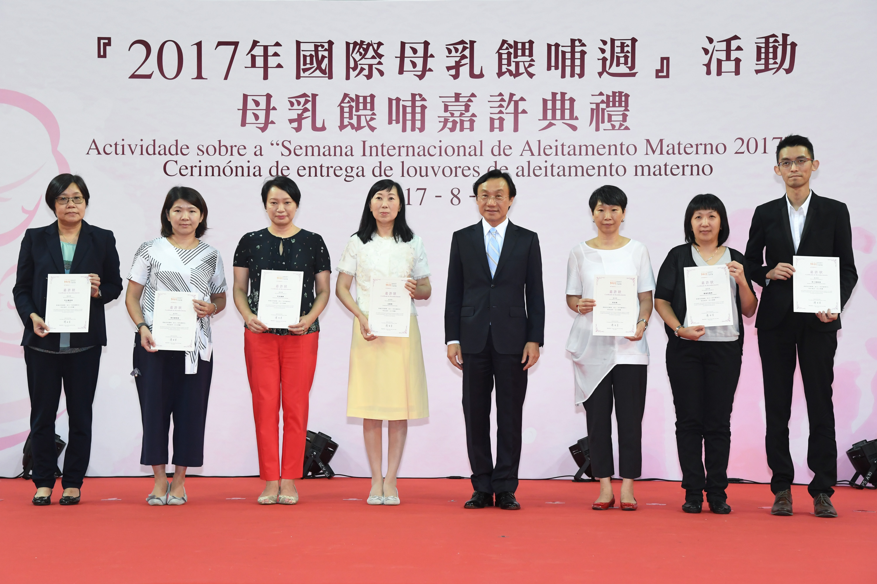 Com vista a coordenar a promoção de uma séria de actividades “Macau – lar feliz e sadio”, dando resposta ao apelo da Aliança Mundial para Acção em Aleitamento Materno (sigla em inglês WABA), que em 2017 criou o tema “Trabalho em conjunto para o bem comum”, a fim de alcançar este objectivo, os Serviços de Saúde, durante o mês de Agosto, vão reforçar a divulgação educativa, sobretudo através da publicidade televisiva, elaborando novos cartazes, aumentando o número de palestras, etc. Em simultâneo, os Serviços de Saúde aproveitaram a Cerimónia para reconhecer as instituições públicas e privadas de Macau que apoiam ao aleitamento materno, bem como as mães que amamentam os bebés com período igual ou superior a seis meses.