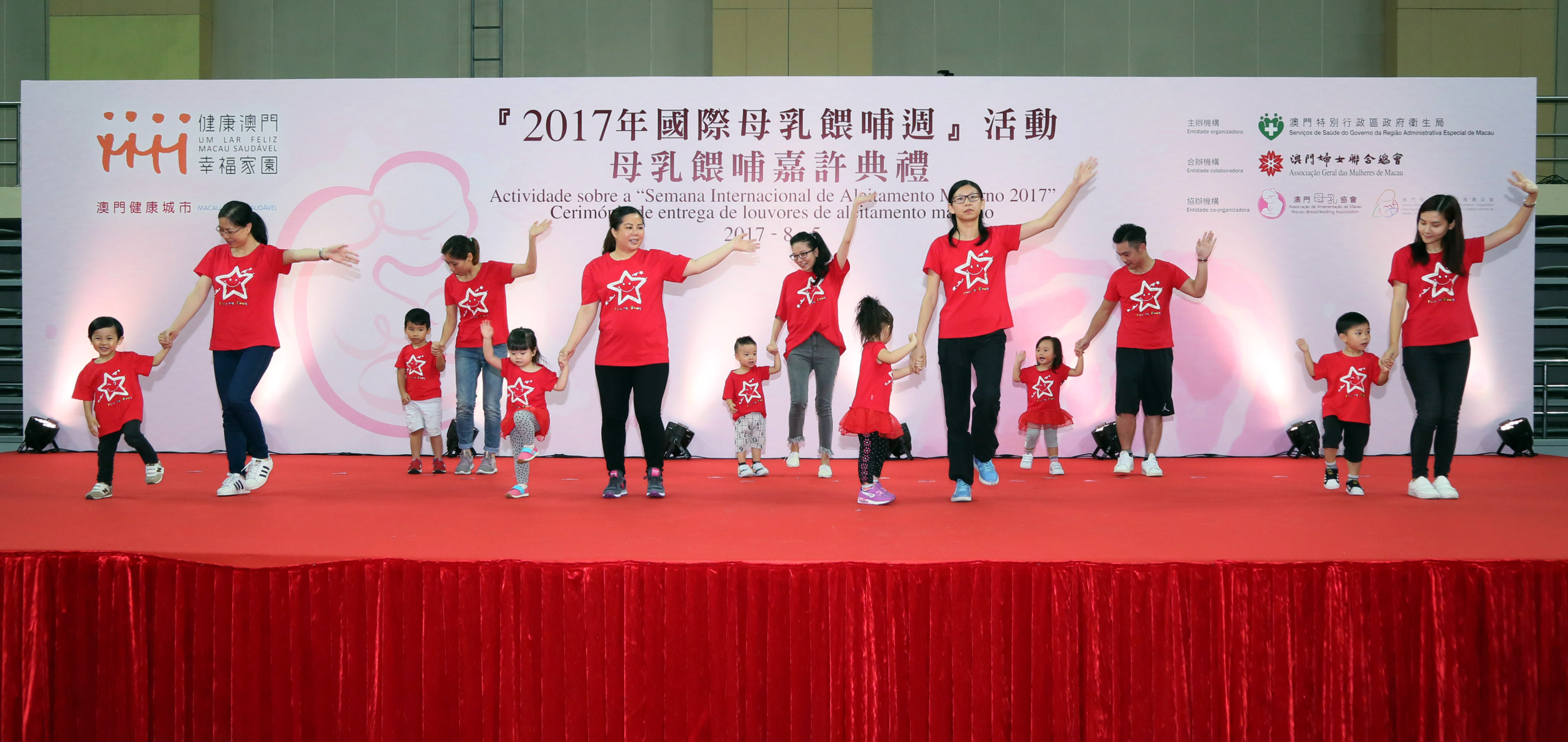 Os Serviços de Saúde, em conjunto com a Associação Geral das Mulheres de Macau, a Associação de Amamentação de Macau e a Associação Promotora de Aleitamento e Cuidados Infantis de Macau, realizaram este sábado (dia 5 de Agosto), a “Cerimónia de entrega de prémios para a promoção de aleitamento materno 2017” que teve lugar no Pavilhão Polidesportivo A do Tap Seac. Há uma expectativa de que, através das acções iniciativas do governo, do apoio da comunidade e da participação de toda a população, seja criado um harmonioso ambiente de amamentação, bem como a sensibilização da sociedade para prestar apoio e atenção no aleitamento materno. Os representantes dos vários Serviços Governamentais liderados pelo Secretário para os Assuntos Sociais e Cultura, Doutor Alexis Tam Chon Weng participaram na Cerimónia, em que estiveram presentes também mais de 500 famílias, o que representou cerca de 2000 participantes.
