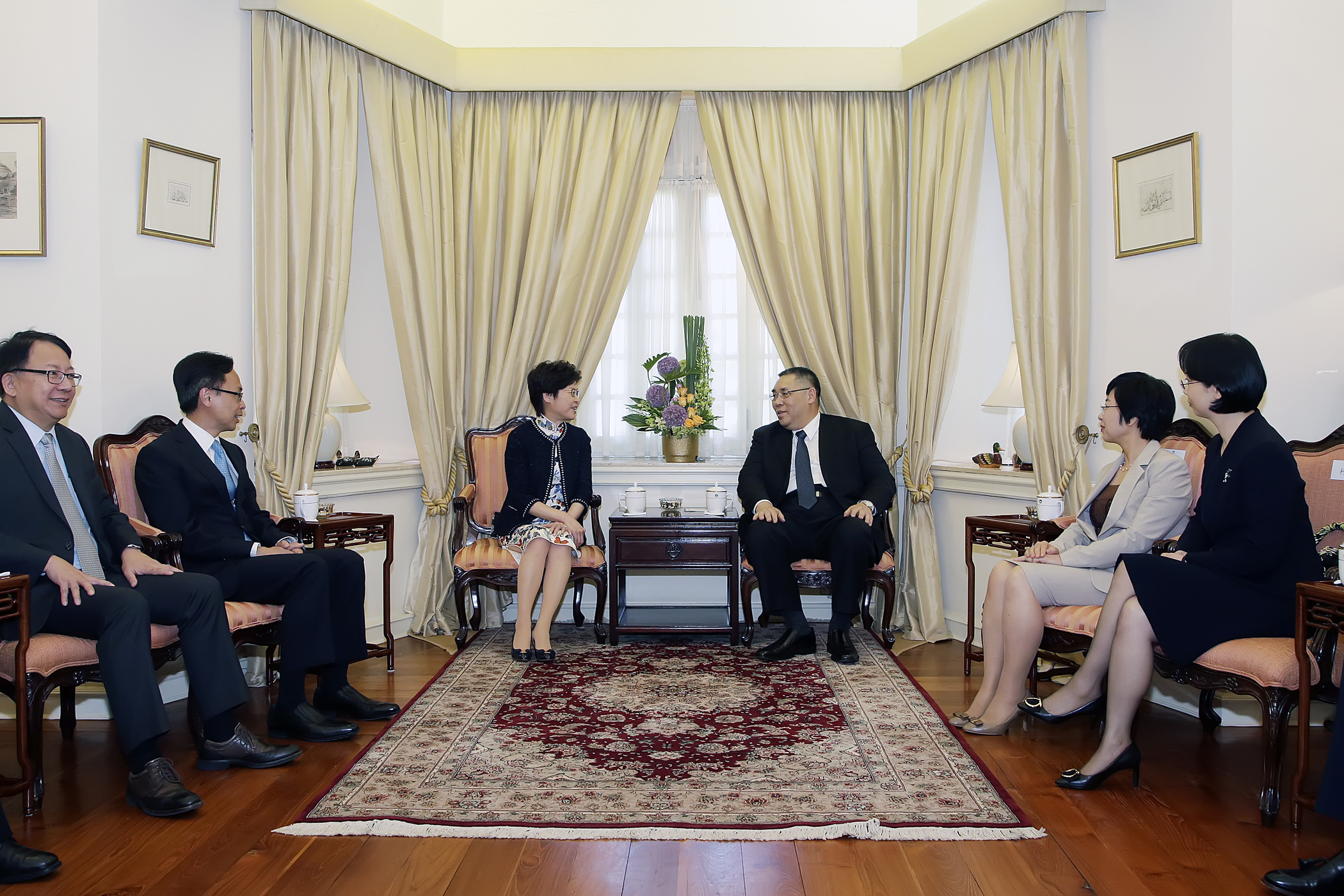 Carrie Lam fez-se acompanhar no encontro pelo secretário para assuntos constitucionais e da China interior, Patrick Nip, e o chefe do Gabinete do Chefe do Executivo, Eric Chan Kwok-ki.
