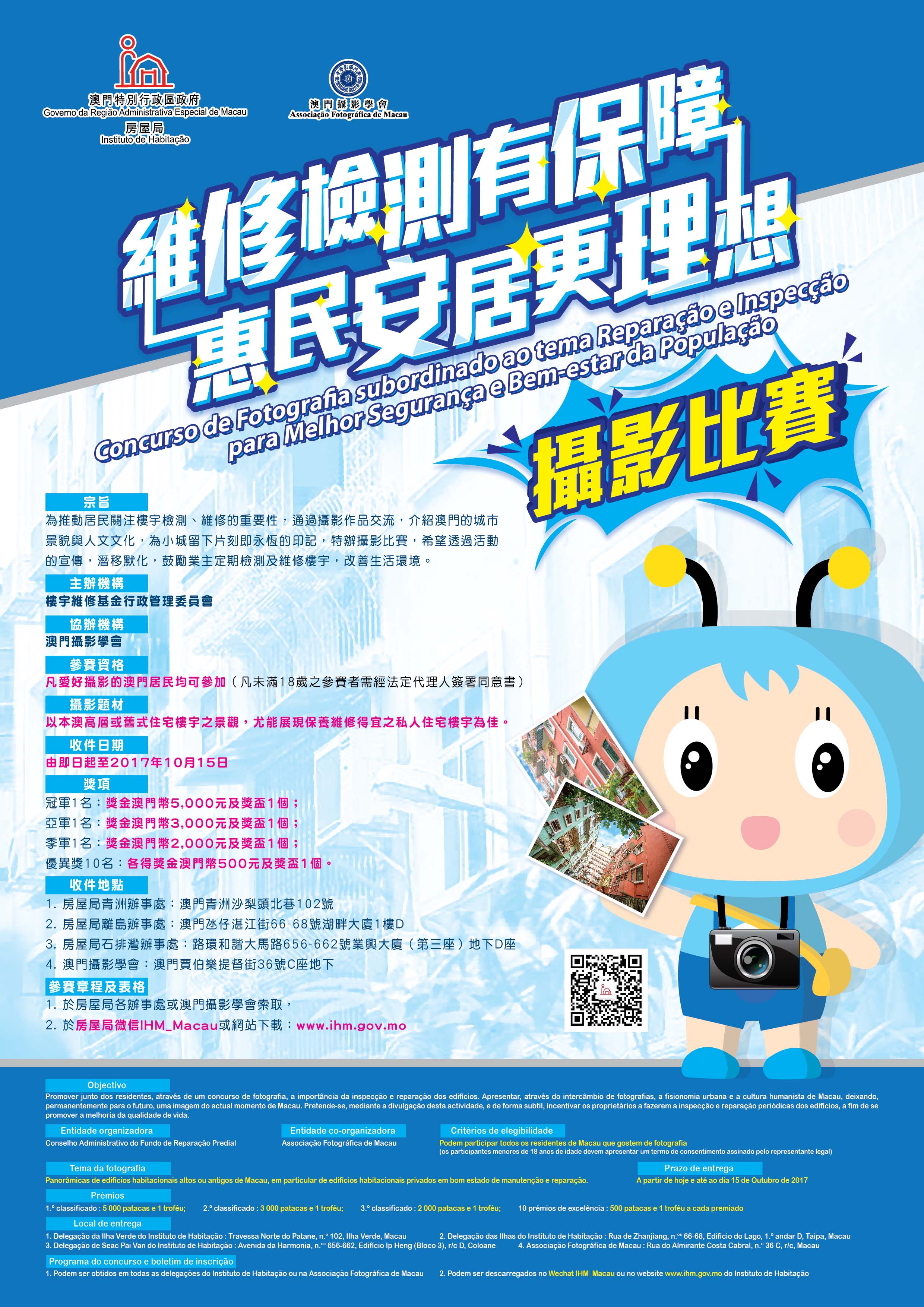 As obras fotográficas podem ser entregues em todas as delegações do Instituto de Habitação e na Associação Fotográfica de Macau (Rua do Almirante Costa Cabral, n.º 36 C, r/c, Macau), podendo o programa e o boletim de inscrição deste concurso ser obtidos nos locais acima mencionados e ser descarregados no Wechat IHM_Macau ou no website (www.ihm.gov.mo) do Instituto de Habitação.