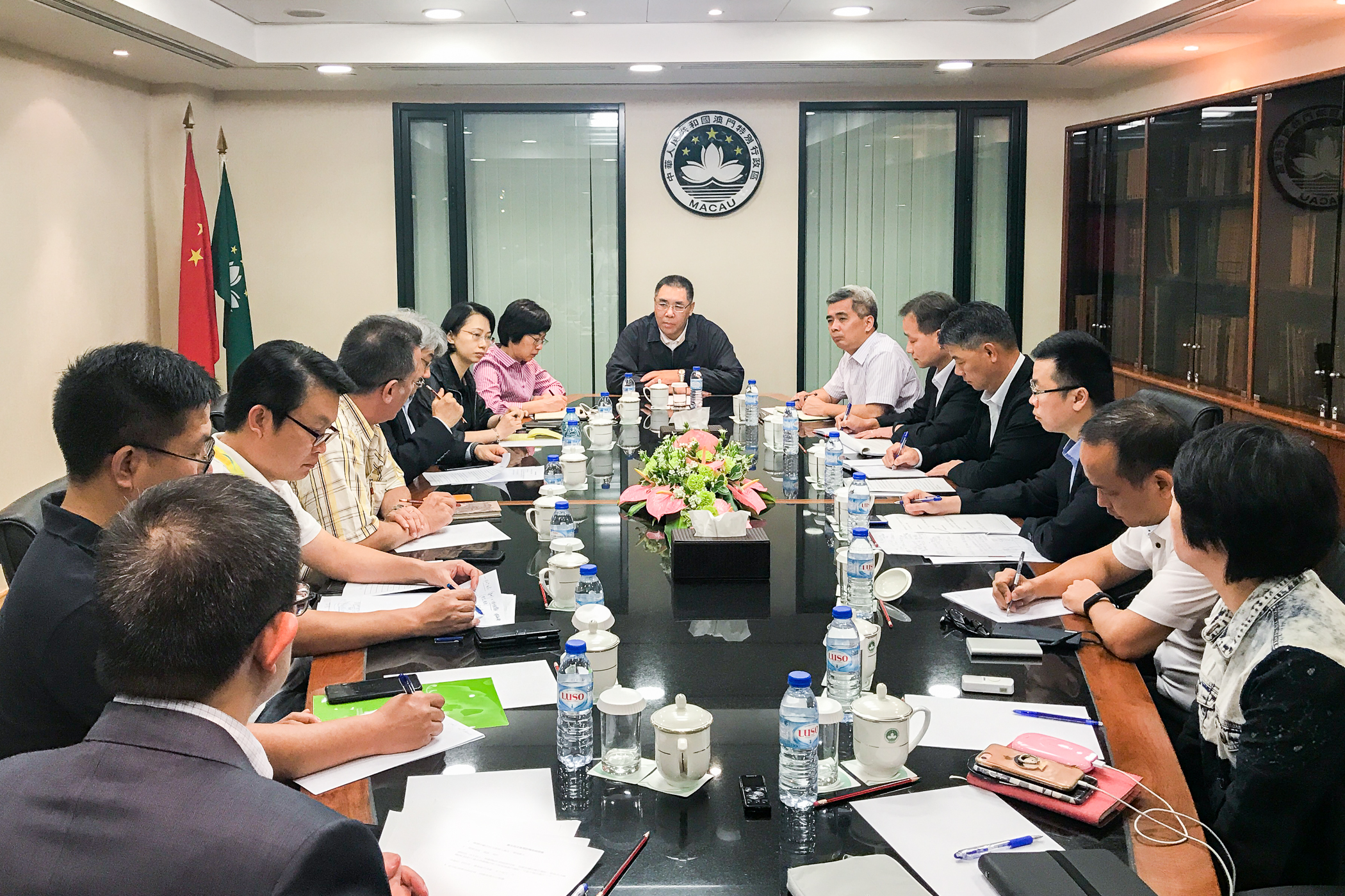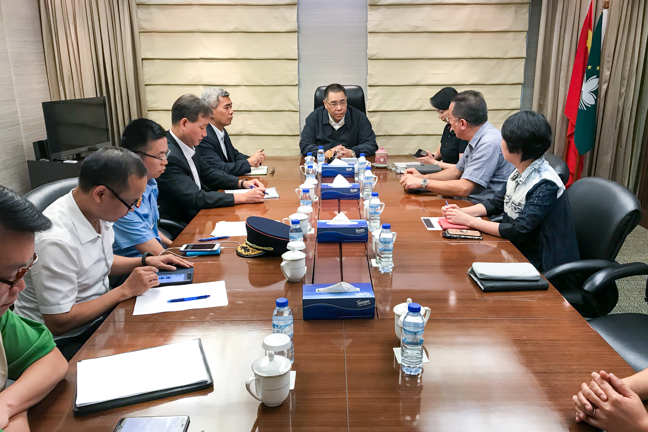 No que se refere à reunião intercalar foram abordadas as tarefas interdepartamentais de acordo com as áreas, tendo participado além dos próprios secretários o comandante-geral dos Serviços de Polícia Unitários, Ma Io Kun, e outras estruturas de protecção civil, nomeadamente, o Corpo de Bombeiros, o Corpo da Policia de Segurança Pública, o Gabinete de Comunicação Social, os Serviços Meteorológicos e Geofísicos, o Instituto para os Assuntos Cívicos e Municipais, os Serviços de Saúde, os Serviços para os Assuntos Marítimos e Águas, entre outros.