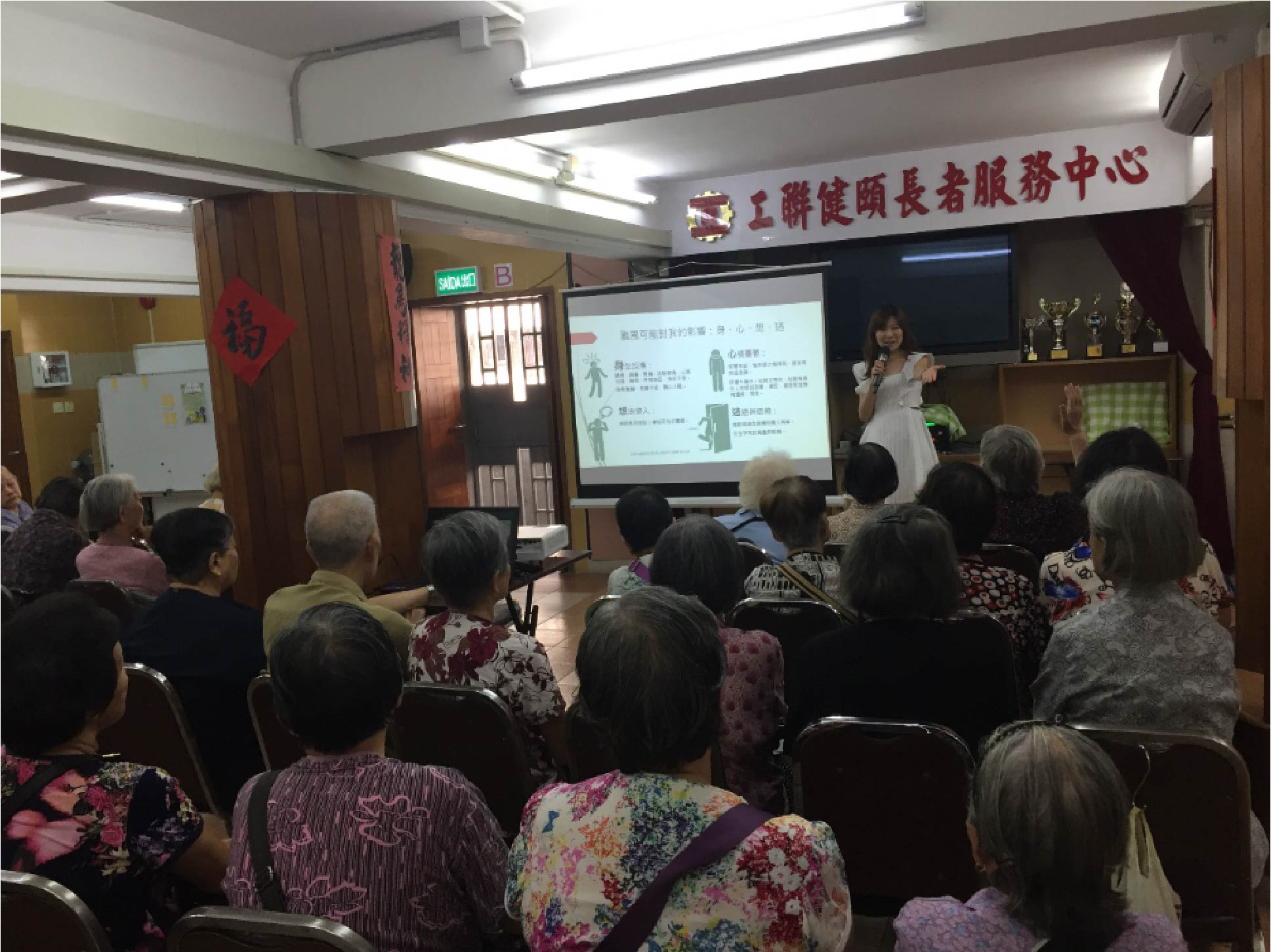 Foram ainda realizados palestras por psicoterapeutas - “Eu, face ao tufão Hato” - nos Centros de Saúde, tendo permitido aos residentes terem conhecimentos sobre protecção em saúde mental perante a catástrofe. Tendo em conta a mobilidade das pessoas idosas, foram realizadas 20 palestras no asilo de idosos e no centro para idosos, das diversas zonas de Macau. Nas palestras, os psicoterapeutas ensinaram, de forma simples, os idosos a lidar com o stress mental perante catástrofes e formas de procurar apoio de modo a proteger a sua saúde mental.