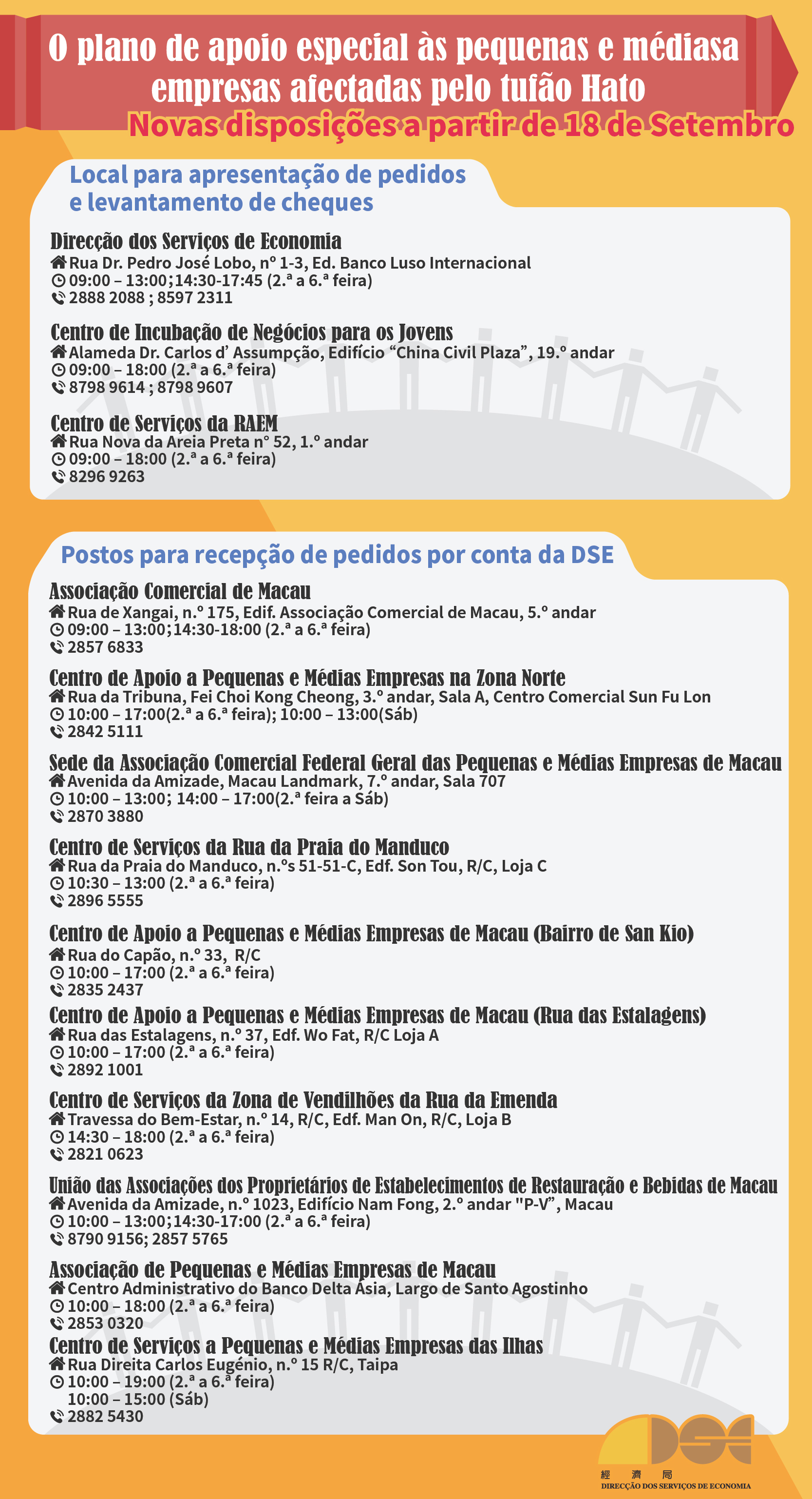Para facilitar a submissão, pelos proprietários das PMEs que foram afectados pelo tufão, dos pedidos relacionados com as duas medidas de apoio, bem como o levantamento dos subsídios, os mesmos podem deslocar-se, até ao dia 30 de Setembro, aos 3 “Locais para apresentação de pedidos e levantamento de cheques” e 10 “Postos para recepção de pedidos por conta da DSE” para entregar os respectivos pedidos. Os 3 “Locais para apresentação de pedidos e levantamento de cheques”incluem a DSE, o Centro de Serviços da RAEM e o Centro de Incubação de Negócios para os Jovens. E os 10“Postos para recepção de pedidos por conta da DSE” são, respectivamente, a Associação Comercial de Macau, a Associação Comercial Federal Geral das Pequenas e Médias Empresas de Macau, o Centro de Apoio a Pequenas e Médias Empresas de Macau (Bairro de San Kio), o Centro de Serviços da Zona de Vendilhões da Rua da Emenda, o Centro de Apoio a Pequenas e Médias Empresas na Zona Norte, o Centro de Serviços da Rua da Praia do Manduco, o Centro de Apoio a Pequenas e Médias Empresas de Macau (Rua das Estalagens), o Centro de Serviços a Pequenas e Médias Empresas das Ilhas, a Associação de Pequenas e Médias Empresas de Macau, e a União das Associações dos Proprietários de Estabelecimentos de Restauração e Bebidas de Macau. Os respectivos endereços e horários de funcionamento encontram-se no quadro em anexo. Para mais informações, é favor telefonar 2888-2088 ou 6297-9762, ou consultar o Website da DSE e a conta oficial de Wechat (DSEMACAU).