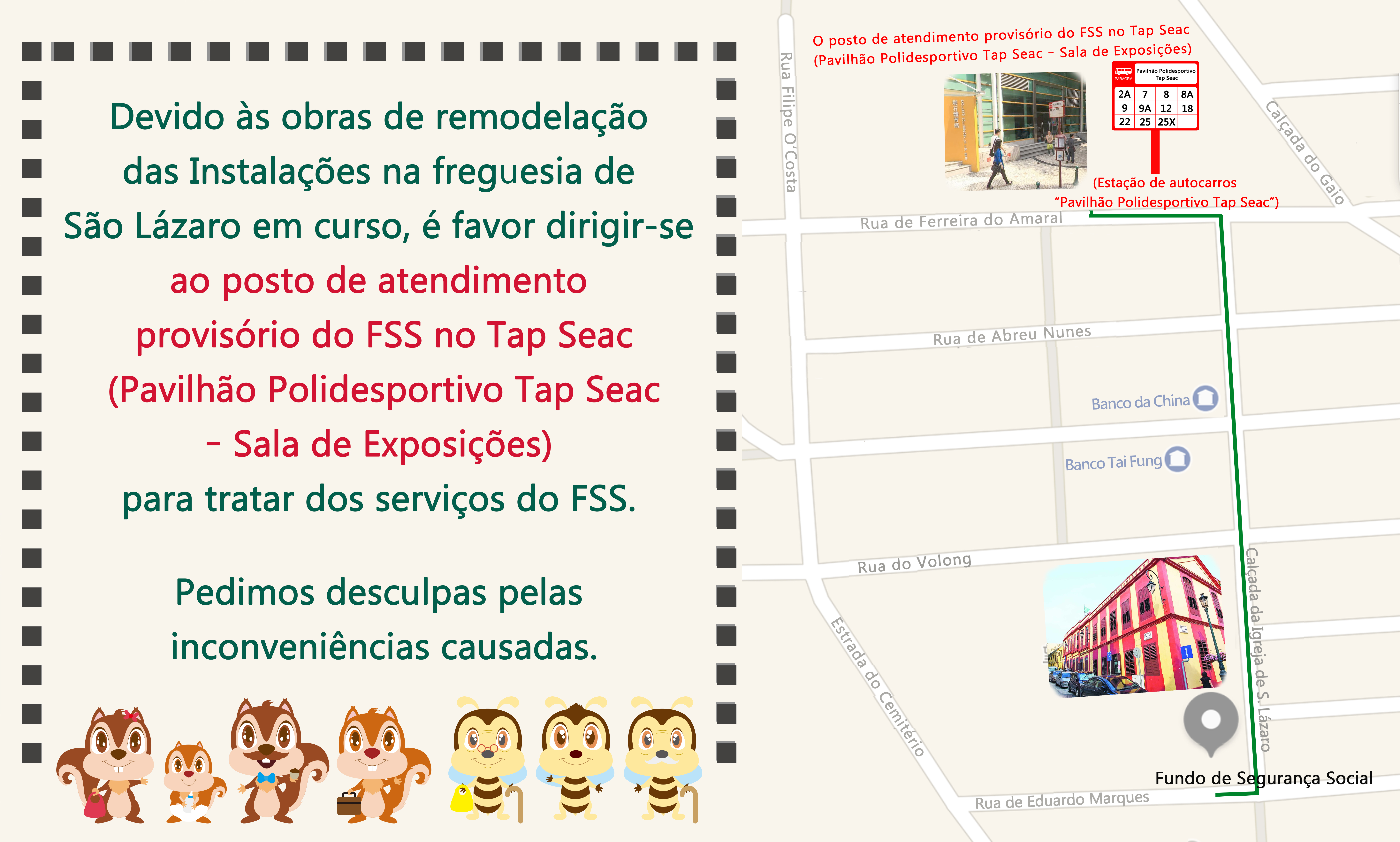 Para a realização de obras de remodelação, foi fechado o edifício das Instalações do FSS na freguesia de São Lázaro, sito na Rua Eduardo Marques. Os cidadãos que queiram tratar dos serviços do FSS nos balcões, tais como pagamento de contribuições, podem dirigir-se ao Posto de Atendimento Provisório no Tap Seac. A entrada do Posto fica em frente à paragem de autocarros “Pavilhão Polidesportivo Tap Seac”, pela qual passam os autocarros de carreiras n.os 2A, 7, 8, 8A, 9, 9A, 12, 18, 22, 25 e 25X. Além disso, os cidadãos ainda podem dirigir-se ao Centro de Serviços da RAEM na Areia Preta (Área de Segurança Social e Integração Laboral). Enquanto que os cidadãos que queiram tratar dos serviços relativos às contribuições, ainda podem dirigir-se às Instalações do FSS no Edf. China Civil Plaza no NAPE, 13.º andar.