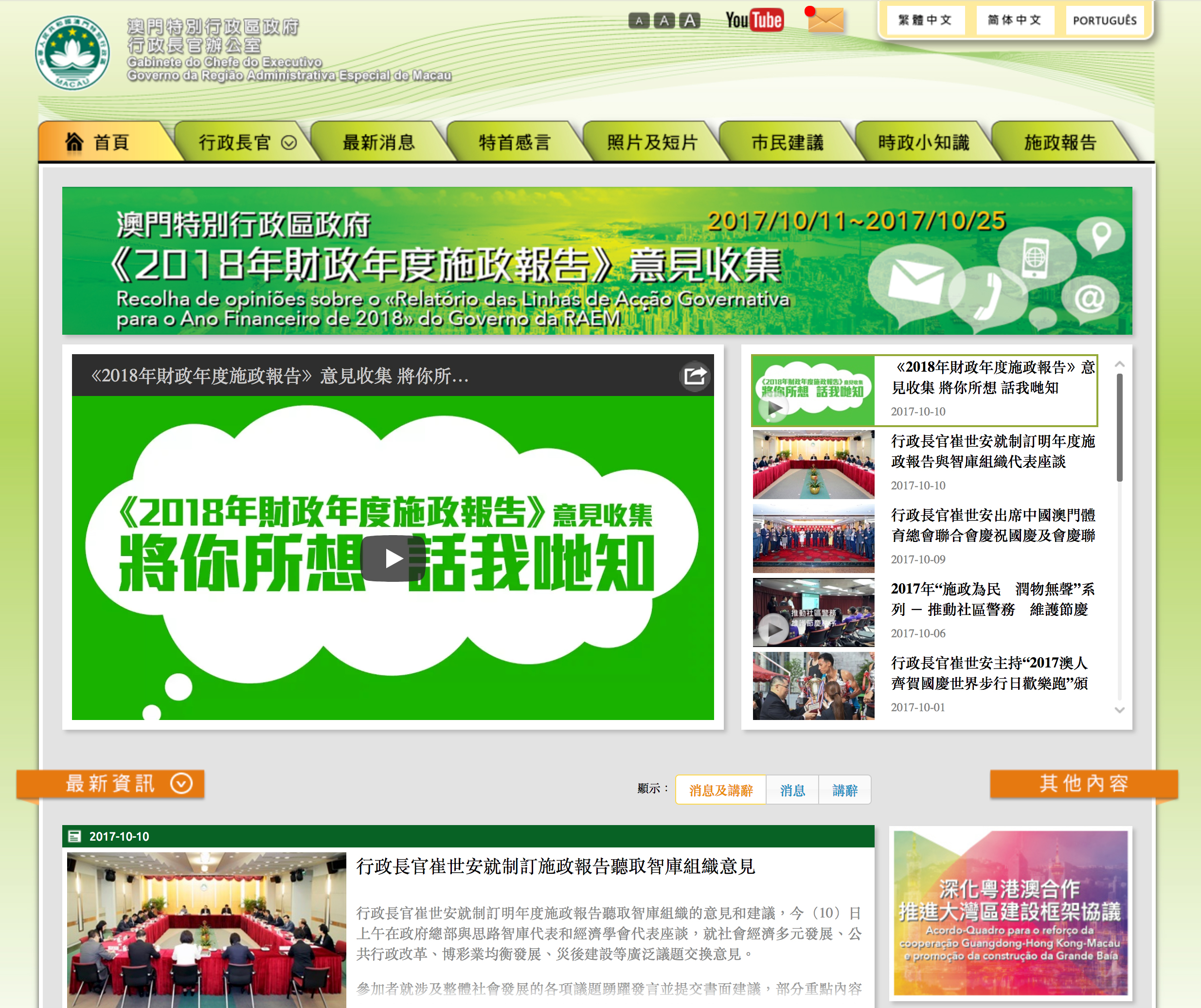 O Governo da Região Administrativa Especial de Macau (RAEM) está a elaborar as Linhas de Acção Governativa para o ano de 2018. Nesse contexto, com o intuito de ouvir uma um maior e mais abrangente número de opiniões do público em geral, inclusive dos diferentes sectores da sociedade, o Governo da RAEM decidiu organizar uma recolha de opiniões que irá decorrer a partir de hoje, 11 de Outubro até ao próximo dia 25 do mesmo mês.