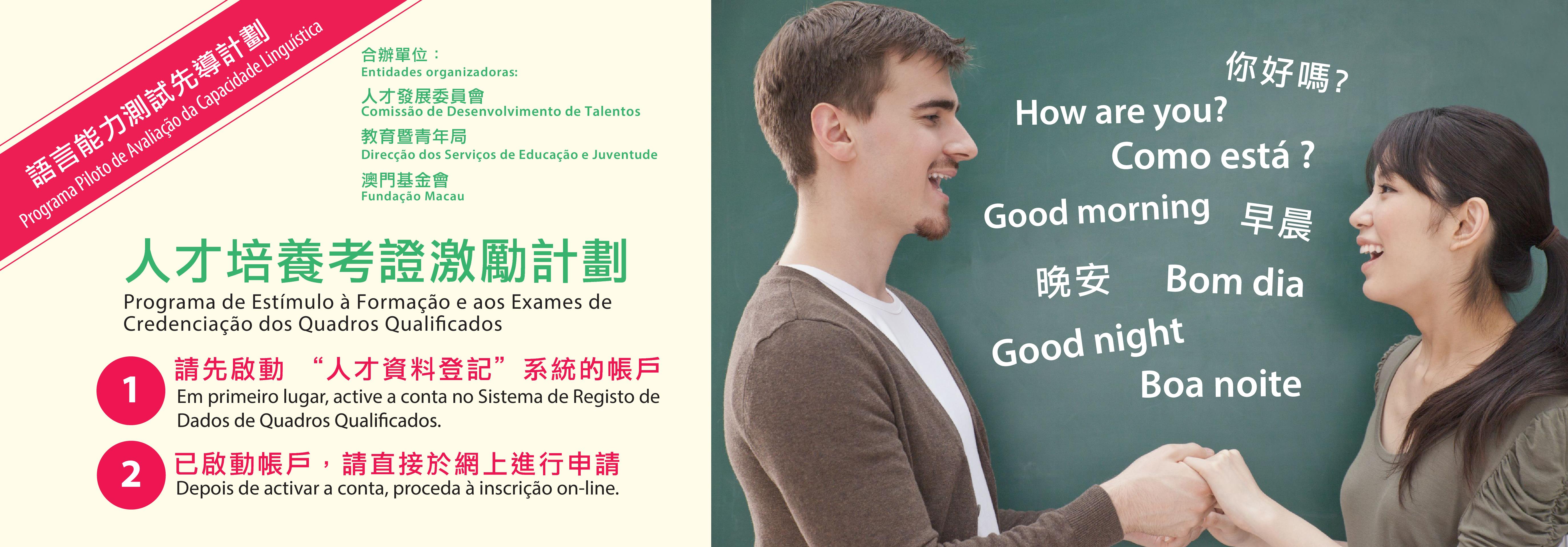 A Comissão de Desenvolvimento de Talentos, a Direcção dos Serviços de Educação e Juventude e a Fundação Macau vão lançar, em conjunto, o “Programa de Estímulo à Formação e aos Exames de Credenciação dos Quadros Qualificados”. Na primeira fase, que decorrerá entre 1 de Novembro de 2017 e 30 de Junho de 2018 (adiante designada por período de atribuição de prémios), será lançado o Programa Piloto de Avaliação da Capacidade Linguística. Os residentes de Macau que participem nos exames, abaixo indicados, e atinjam o correspondente nível requerido podem requerer prémios. Aos que forem admitidos podem ser atribuídas mil patacas como prémio pecuniário. Entretanto, durante o período, acima mencionado, os participantes só podem receber um prémio por cada exame.