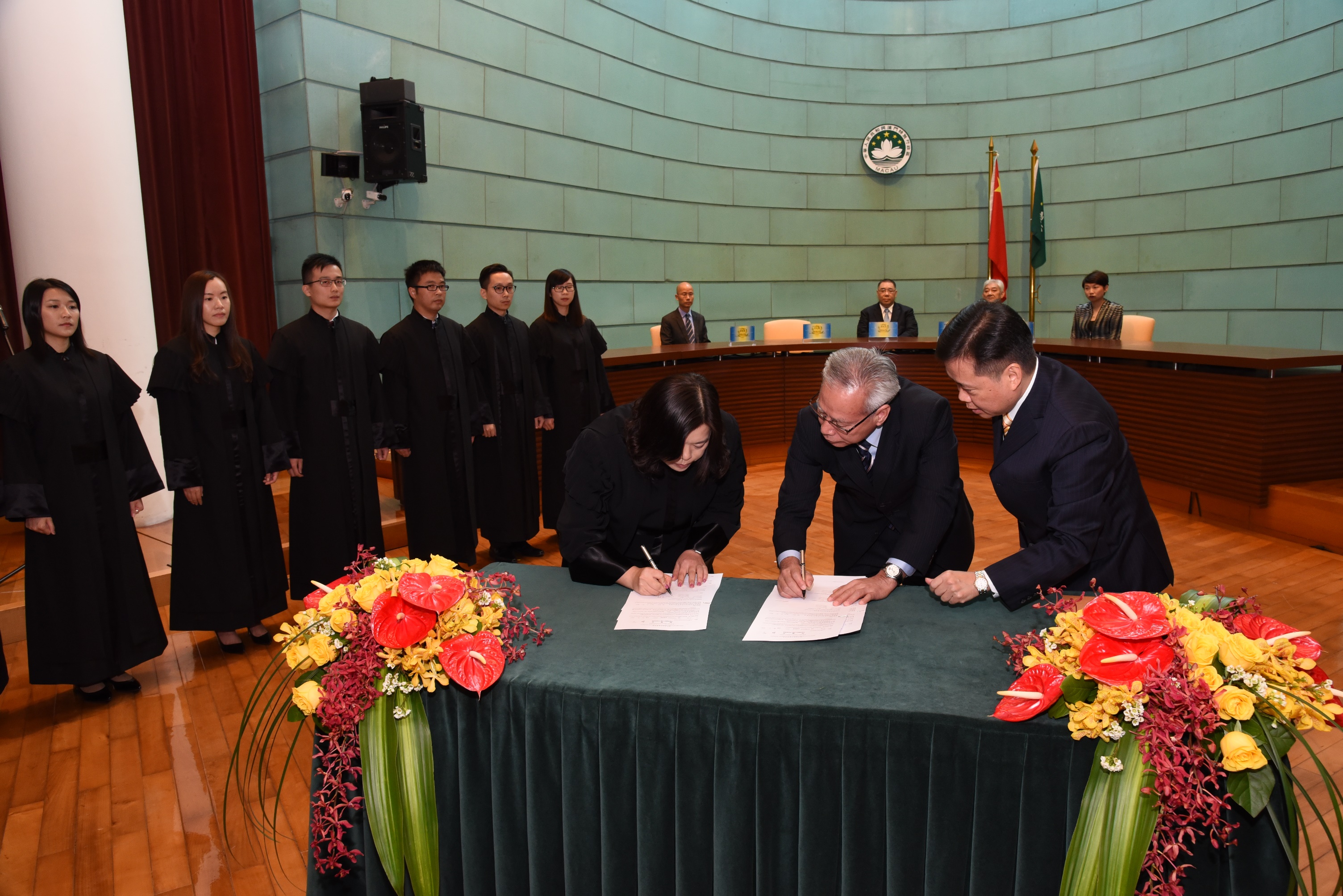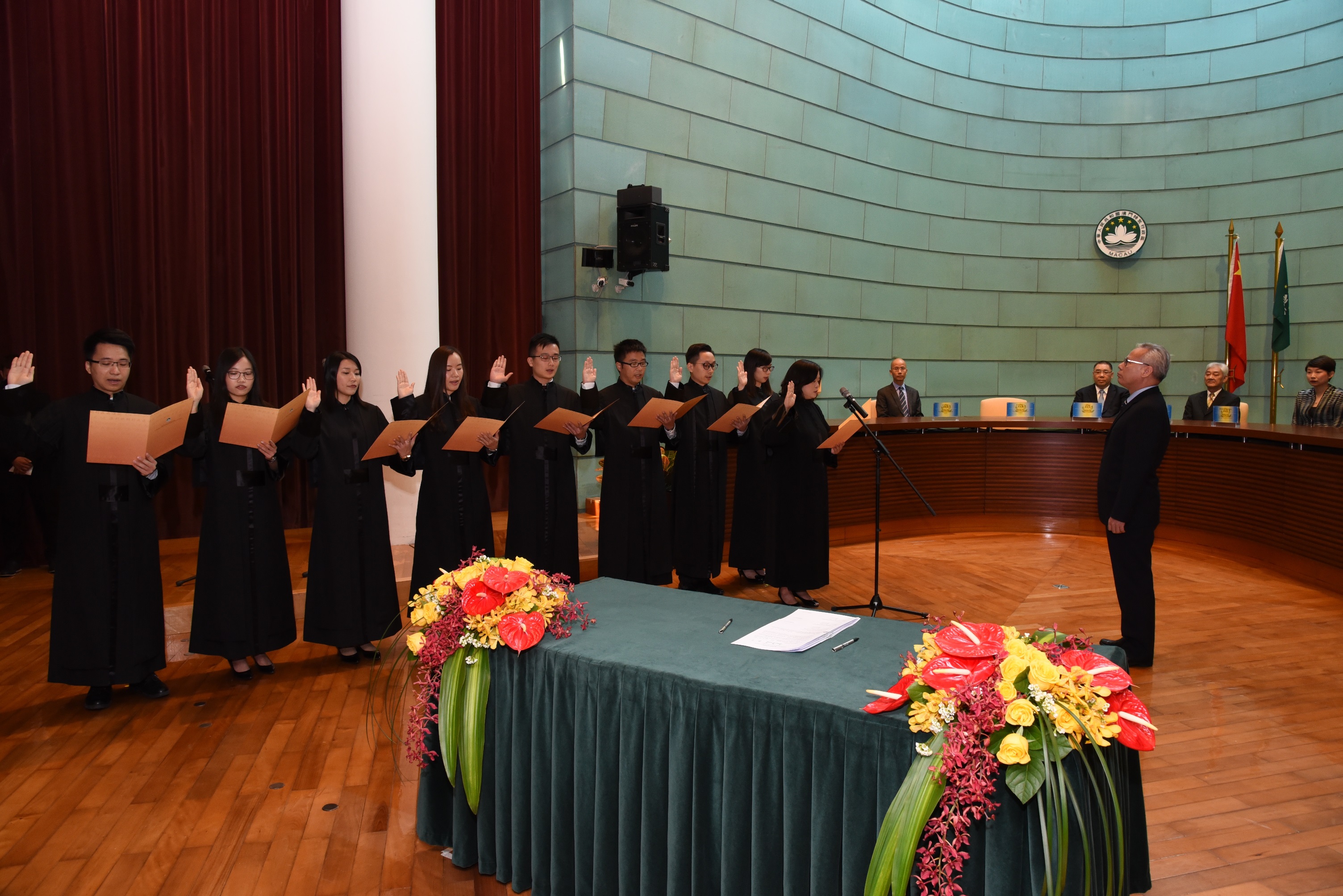 A 1 de Novembro de 2017, pelas 12H00, foi realizada a cerimónia da tomada de posse na sala de audiência do Edifício dos Tribunais de Segunda e Última Instâncias. Os nove Juízes prestaram juramento de posse perante o Presidente do Tribunal de Última Instância, Dr. Sam Hou Fai, que presidiu à cerimónia, e teve como convidados de honra o Chefe do Executivo, Chui Sai On, o Presidente da Comissão Independente para a Indigitação de Juízes, Lau Cheok Va, o Presidente do Tribunal de Segunda Instância, Dr. Lai Kin Hong, e a Presidente do Tribunal Judicial de Base e do Tribunal Administrativo, Dr.ª Io Weng San. Além disso, a Secretária para a Administração e Justiça, o Comissário do CCAC, os membros da Comissão Independente para a Indigitação de Juízes, os Juízes dos tribunais das várias instâncias e os Delegados do Procurador, os dirigentes dos demais Serviços e os trabalhadores dos tribunais também presenciaram e testemunharam a tomada de posse dos nove Juízes.