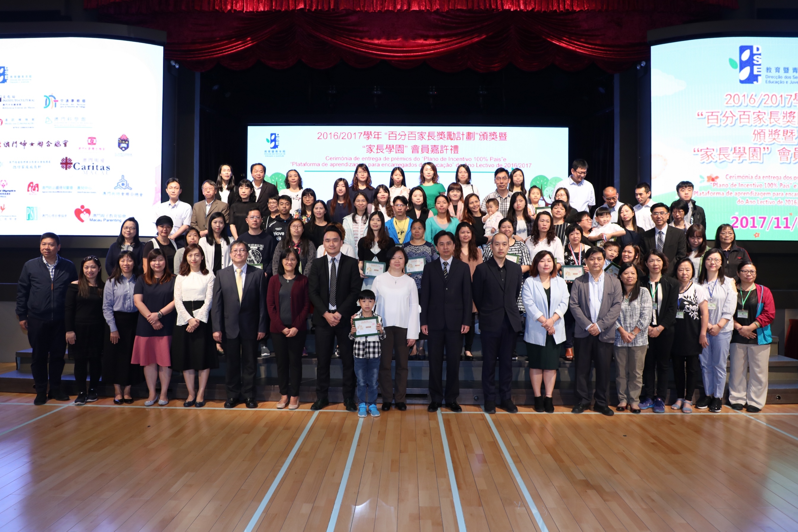 Para distinguir os encarregados de educação que participaram, de forma entusiástica e positiva, na educação parental e actividades para a família, a DSEJ realizou a cerimónia de entrega dos prémios do “Plano de Incentivo 100% Pais” e dos louvores da “Plataforma de Aprendizagem para Encarregados de Educação” do ano lectivo de 2016/2017, que teve lugar no dia 5 de Novembro, pelas 10:30, no auditório da Escola São Paulo, bem como a cerimónia de lançamento do “Plano de Incentivo 100% Pais” do ano lectivo de 2017/2018, que contaram com a presença da subdirectora da DSEJ, Leong Vai Kei, o chefe do Departamento de Estudos e Recursos Educativos da DSEJ, Wong Kin Mou, o chefe do Departamento de Ensino da DSEJ, Kong Chi Meng, a curadora geral do Museu das Comunicações, Wong Kam Ian e chefe do Departamento de Exibições e de Educação do Centro de Ciência de Macau, Leong Si Chong, bem como de mais 60 representantes das instituições educativas e associações.