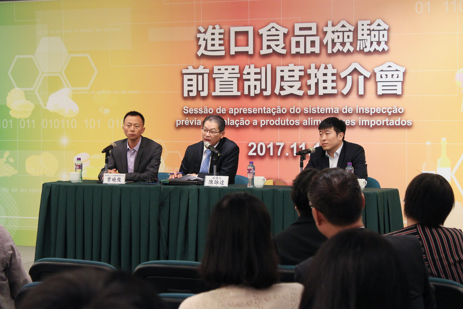Com o intuito de ajudar as empresas de Macau a agarrarem as oportunidades e a explorarem o grande mercado chinês com melhor aproveitamento das medidas convenientes para a inspecção dos produtos alimentares, a Direcção dos Serviços de Economia (DSE) realizou, em 10 de Novembro de 2017, a “Sessão de apresentação do sistema de inspecção prévia em relação a produtos alimentares importados”, na qual foram convidados o chefe da sessão da Divisão de Produtos Alimentares da Administração de Inspecção e Quarentena para Saída e Entrada pela Fronteira de Zhuha, Zeng Xiaojun, e o vice-gerente geral da Companhia de Inspecção Análise Chong Kim (Macau) Limitada, Ding Xiaoyu, como oradores a apresentar junto do respectivo sector de Macau o conteúdo sobre o Sistema de Inspecção Prévia em relação a Produtos Alimentares Importados, designadamente, os métodos específicos de operação, procedimentos de candidatura, etc.