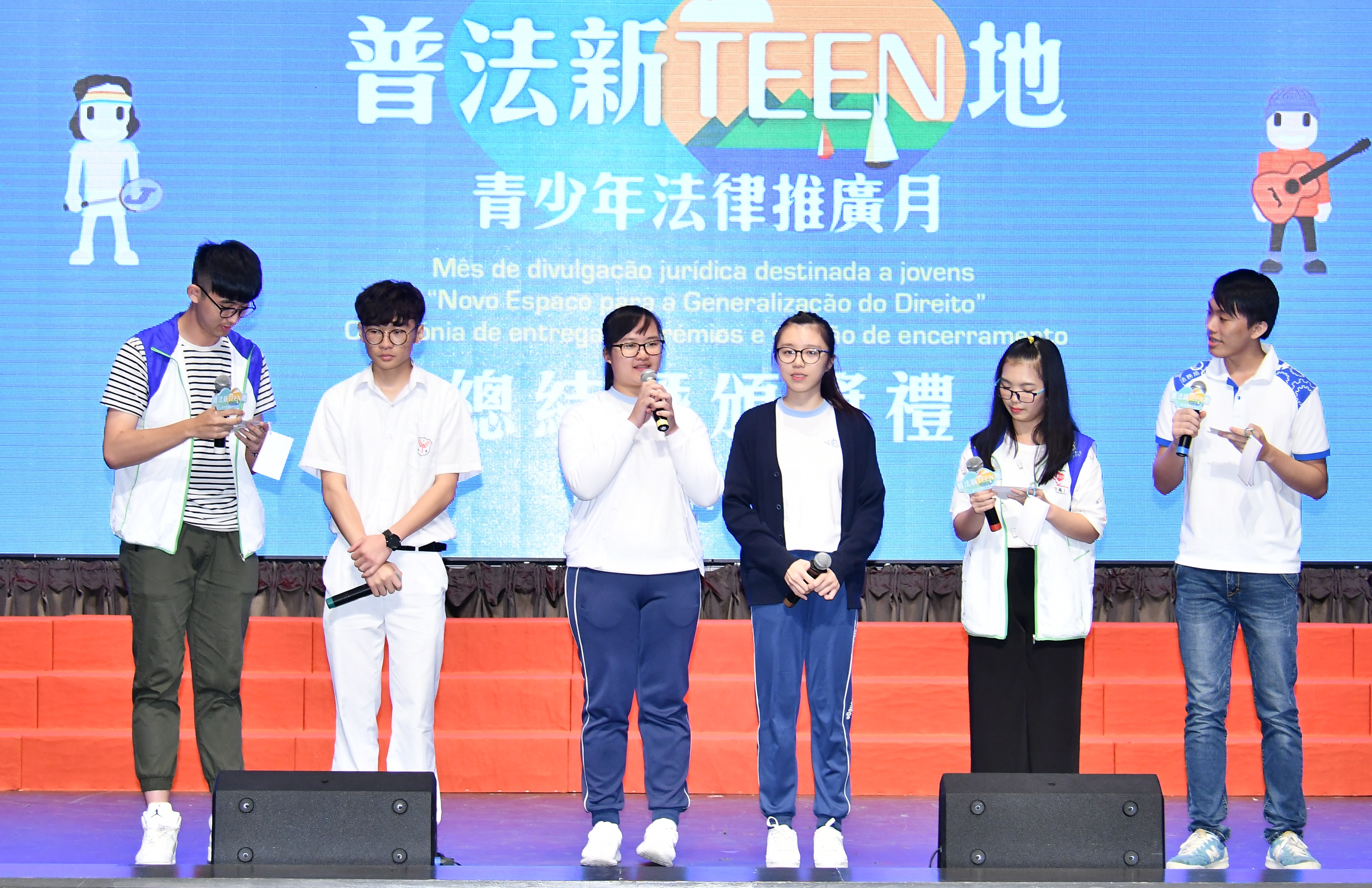 No sentido de prosseguir com a divulgação da generalização do direito e realizar um balanço da eficácia das actividades envolvidas, as entidades organizadoras realizaram a Cerimónia de entrega dos prémios e a sessão de encerramento do mês de divulgação jurídica destinada a jovens “Novo Espaço para a Generalização do Direito”, no dia 12 de Novembro, no auditório da Escola São Paulo, que contaram com a presença dos seguintes convidados: a chefe do Departamento de Divulgação Jurídica e Relações Públicas da Direcção dos Serviços de Assuntos de Justiça, Lo Cheng Peng, o chefe do Departamento de Juventude da DSEJ, Chan Iok Wai, a chefe do Departamento de Emprego da Direcção dos Serviços para os Assuntos Laborais, Mang Sui Yee Margaret, o chefe do Departamento de Operações do Corpo de Polícia de Segurança Pública, substituto, Chio Song Un, o director da Escola de Polícia Judiciária, Suen Kam Fai, a chefe do Departamento do Património Cultural do Instituto Cultural, Leong Wai Man, a chefe da Divisão de Formação e Informação Cívicas do IACM, substituta, Chin Wai Iok, o comissário dos Serviços de Polícia Unitários, Lo Chi Keong, o chefe funcional da Equipa de Coordenação dos Serviços da Divisão de Apoio Comunitário do Instituto de Acção Social, Wong Pak Kei, os membros do Conselho de Educação para o Ensino Não Superior, Pe. Alejandro Salcedo Garcia e Henrique Miguel de Senna Fernandes, a representante de membro do Conselho de Educação para o Ensino Não Superior, Leong Man Ngan , bem como representantes das escolas/instituições. Os convidados entregaram, respectivamente, os certificados de agradecimento a 31 escolas/instituições, que participaram nestas actividades, como forma de agradecimento pelo apoio prestado nestas actividades, convidando ainda os jovens para partilharem os seus sentimentos por terem participado no mês da divulgação e que a sua participação nas actividades diversificadas os levou a adquirirem diversos conhecimentos de direito. Por último, foi realizado o jogo interactivo de informações jurídicas pelos voluntários da “Força motriz para a divulgação jurídica” da Direcção dos Serviços de Assuntos de Justiça com o público jovem, e um espectáculo da canção “Lei da Cidade Pequena” apresentado, em conjunto, pelo cantor de Macau, Cheng Man Cheng Kevin e pelas estudantes do Colégio de Santa Rosa de Lima - Secção Inglesa, para apresentar um rap com conteúdo alusivo à “Lei Básica”. A iniciativa terminou de forma muito animada.