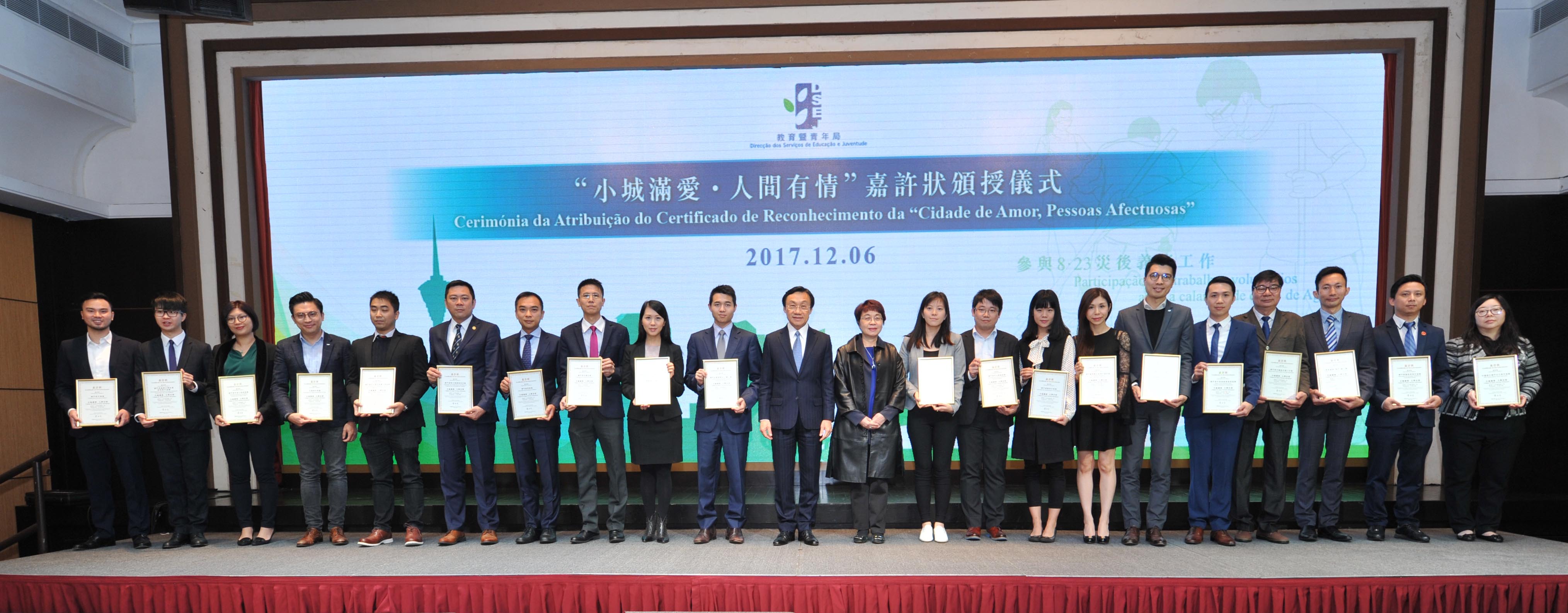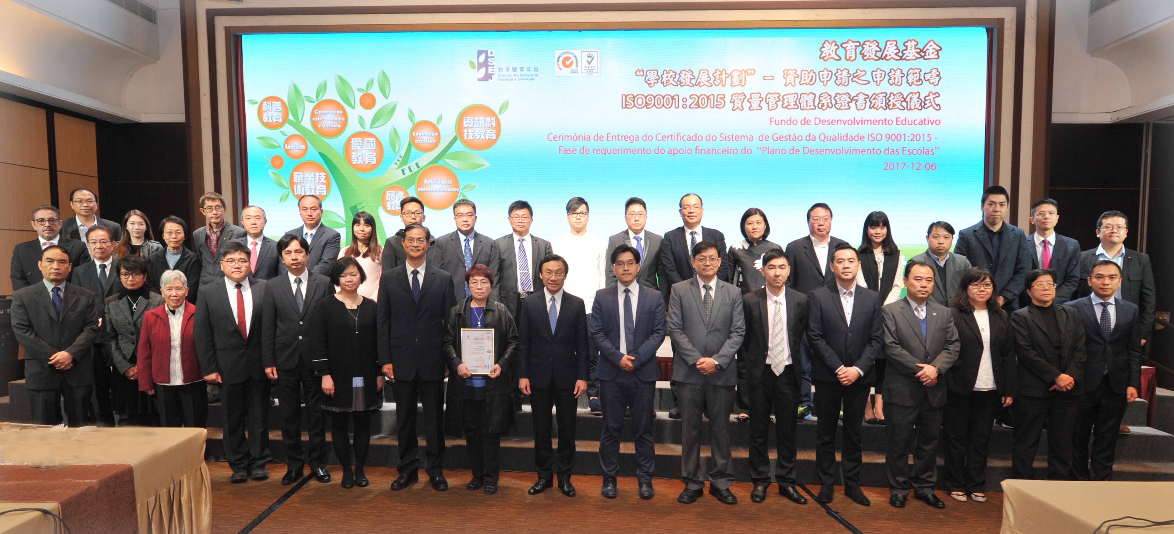 A reunião conjunta dos Conselhos de Educação para o Ensino Não Superior e de Juventude teve lugar na tarde do dia 6 de Dezembro, na Torre de Macau, e foi presidida pelo presidente dos dois conselhos, o Secretário para os Assuntos Sociais e Cultura, Alexis Tam Chon Weng. Antes do início da reunião, realizou-se a Cerimónia de Entrega do Certificado do Sistema de Gestão da Qualidade ISO 9001:2015, relativa à fase de requerimento do apoio financeiro do “Plano de Desenvolvimento das Escolas” e foram atribuídos os Certificados de Reconhecimento “Cidade de Amor, Pessoas Afectuosas” às associações juvenis que participaram nos trabalhos voluntários realizados após a calamidade resultante da passagem do tufão Hato pela região.
