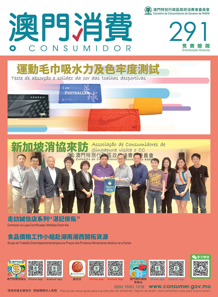 O Conselho de Consumidores (CC) levou a cabo um teste às toalhas desportivas, cujos resultados mostraram que algumas amostras descoloraram após ensopadas na água de piscina. O relatório do referido teste já se encontra disponível na revista “O Consumidor” n.º 291, na qual também se publicou uma notícia sobre o intercâmbio entre o CC e a Associação de Consumidores de Singapura.