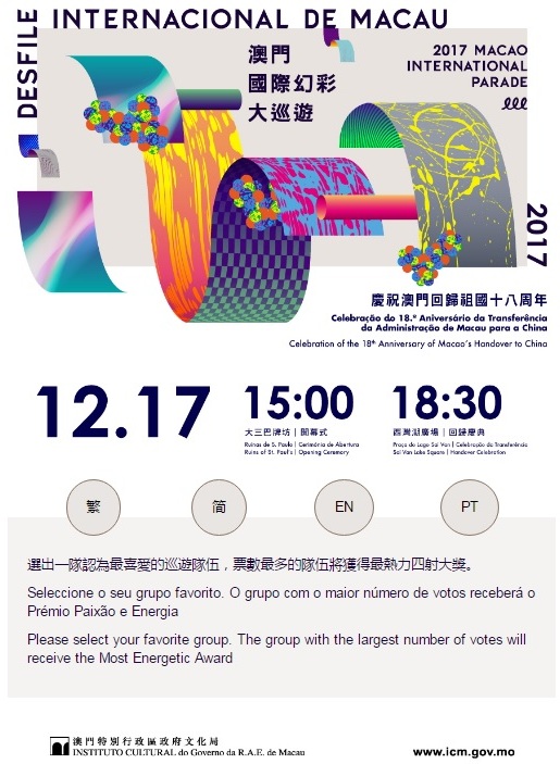 O Desfile Internacional de Macau 2017, organizado pelo Instituto Cultural, em Celebração do 18.º aniversário da Transferência de Administração de Macau para a China, terá lugar no dia 17 de Dezembro (Domingo), convidando residentes e turistas a participarem numa festa de “Amor, Paz e Integração Cultural”, celebrando em conjunto a transferência da administração. O Desfile deste ano conta com a participação de um total de 64 grupos locais e estrangeiros que desfilam pelas ruas de Macau e o público pode votar no seu grupo favorito.