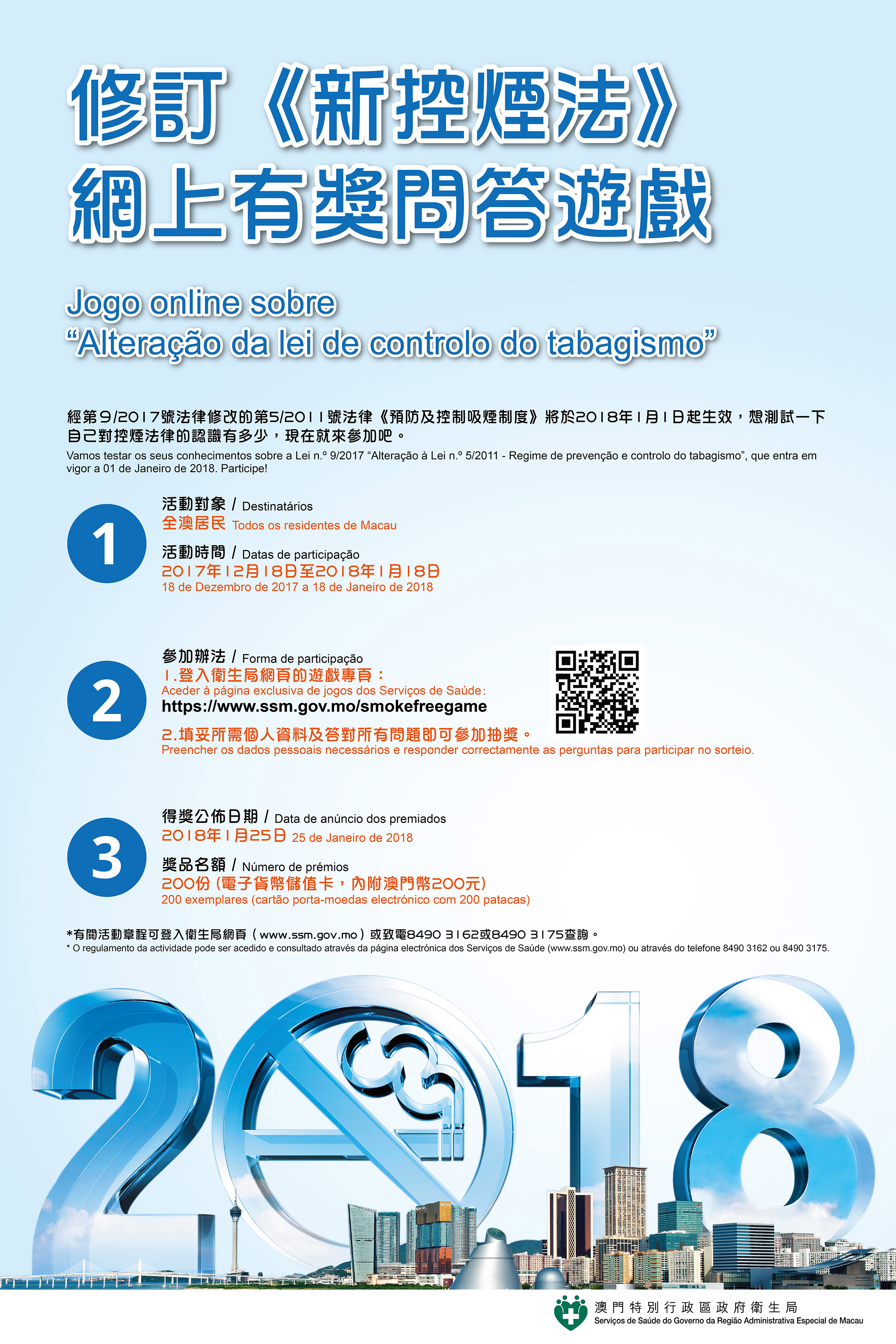 Os interessados em participar devem aceder à página electrónica temática dos Serviços de Saúde denominada - “Jogo online sobre Alteração da lei de controlo do tabagismo” e quem conclua com sucesso as questões serão incluídos num sorteio de prémios. Vinte (20) vencedores receberão um cartão porta-moedas electrónico com um valor de MOP200.