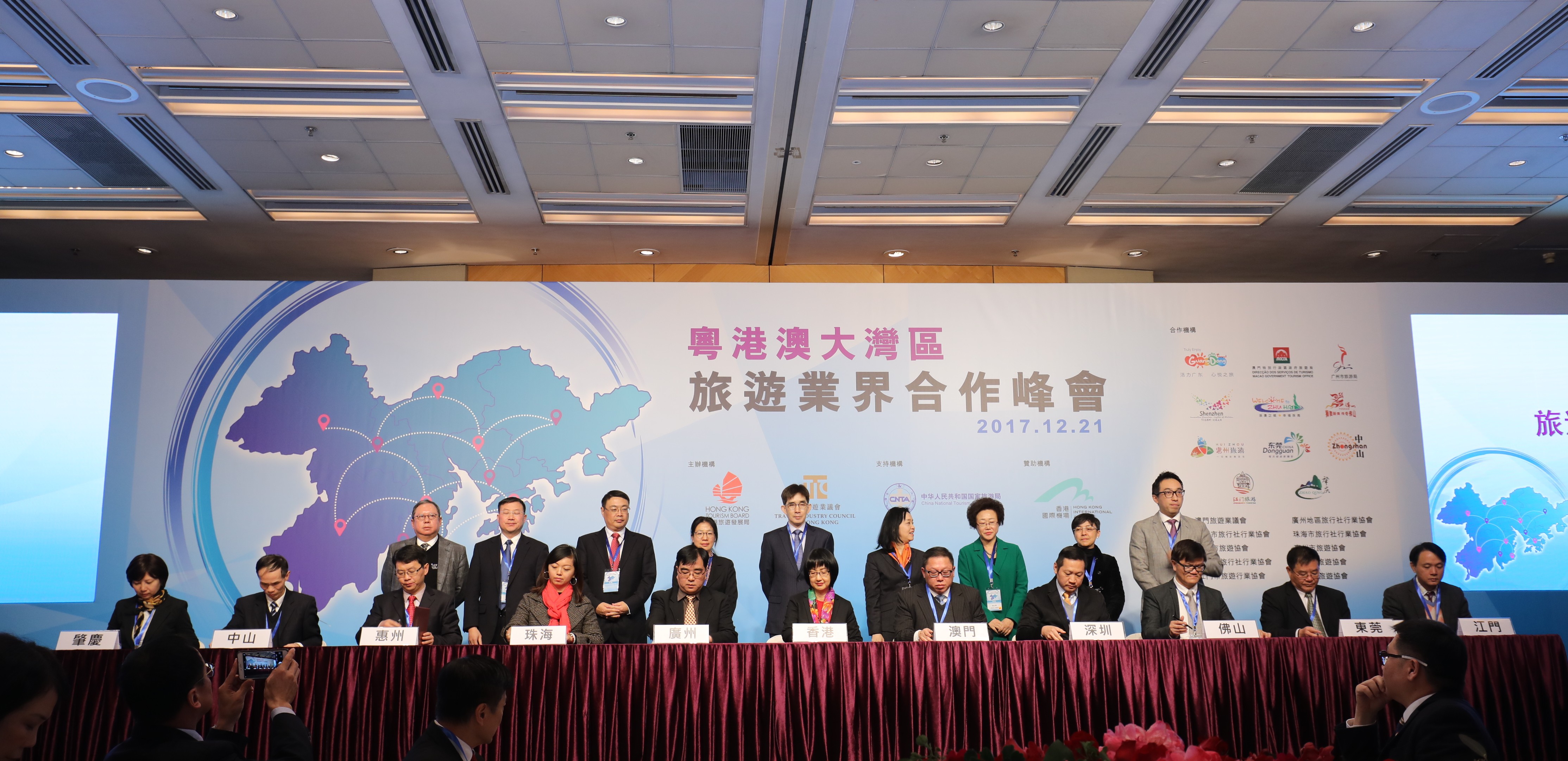 O secretário para o Desenvolvimento Comercial e Económico do Governo da Região Administrativa Especial de Hong Kong, Edward Yau Tang-wah, o secretário permanente para o Desenvolvimento Comercial e Económico do Governo da Região Administrativa Especial de Hong Kong, Philip Yung Wai-hung, a subdirectora do Centro de Intercâmbio de Turismo da Ásia, Cui Suxiang, a directora geral da Administração do Turismo de Guangdong, Zeng Yingru, o vice-governador do munícipio de Guangzhou, Wang Dong, o vice-governador do munícipio de Shenzhen, Wu Yihuan, o membro do comité permanente do Partido Comunista da China do município de Zhuhai, Guo Caiwu, a directora da DST, Maria Helena de Senna Fernandes, o presidente da Administração do Turismo de Hong Kong, Peter Lam Kin-Ngok, e o presidente do Conselho da Indústria do Turismo de Hong Kong, Jason Wong, estiveram presentes na cerimónia de assinatura do Acordo de Cooperação da Indústria do Turismo da Grande Baía de Guangdong-Hong Kong-Macau.