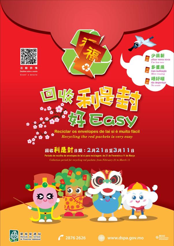 Com o objectivo de concretizar a política ambiental de “recolha e reciclagem de resíduos, este ano a Direcção dos Serviços de Protecção Ambiental (DSPA) volta a realizar a actividade “Reciclar os envelopes de lai si é muito fácil” durante o ano novo chinês, sendo apoiada por quase 150 organizações, com mais de 600 postos de recolha, o que facilita a participação dos cidadãos e contribui para um ano novo chinês verde.