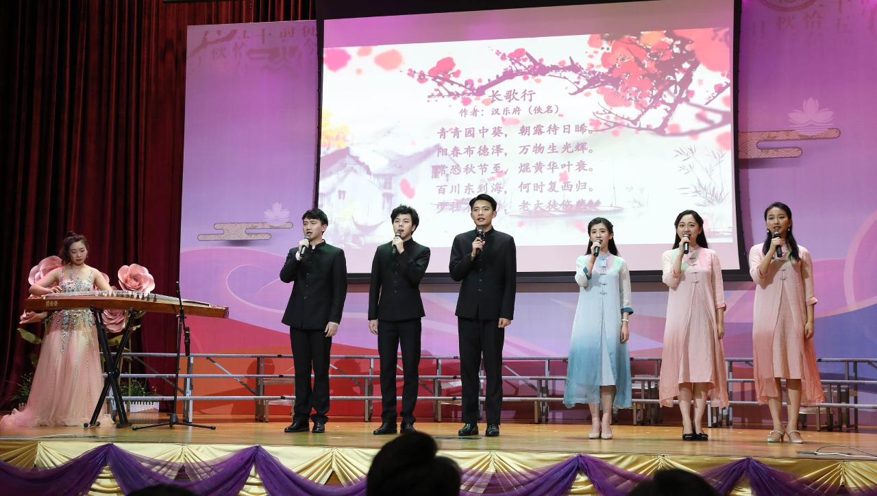 A sessão decorreu com maravilhosos espectáculos, feitos pelos alunos da Universidade de Artes de Nanjing, Universidade Agrícola de Nanjing e Universidade Normal do Noroeste, que consistiram em declamação, dobragem, lengalenga, etc., combinando elementos de canto, dança, Guzheng e caligrafia chinesa, que demonstraram as obras chinesas clássicas, lindas e cheias de significado. Teve lugar ainda uma recitação em grupo, apresentada pelas alunas do ensino secundário da Escola Nossa Senhora de Fátima, que deram voz aos clássicos. Noutra parte os alunos imitaram as lengalengas uns dos outros, em mandarim, de forma muito divertida, que obteve uma reacção efusiva e calorosa de todos. Na exibição de caligrafia chinesa, com o acompanhamento de Guzheng e da dança, criaram uma agradável atmosfera. Após a conclusão desta obra de caligrafia chinesa, os participantes no espectáculo presentearam o director Lou Pak Sang com a mesma e, num ambiente de partilha, encorajaram os participantes a adquirirem um espírito de constante auto-valorização e tolerância. Os espectáculos excelentes feitos por alunos receberam os aplausos de todos os participantes e o evento terminou numa atmosfera agradável.