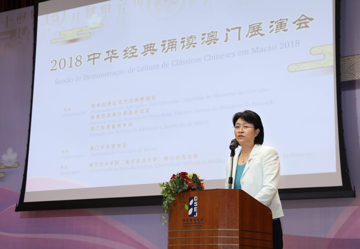 A “Sessão de Demonstração de Leitura de Clássicos Chineses em Macau 2018”, organizada pelo Departamento de Aplicação e Administração Linguística do Ministério da Educação da China, pelo Gabinete para os Assuntos de Hong Kong, Macau e Taiwan e pela Direcção dos Serviços de Educação e Juventude (DSEJ), em colaboração com a Associação de Educação de Macau e realizada pelas Universidades de Artes de Nanjing, Agrícola de Nanjing e Normal do Noroeste, teve lugar no dia 17 de Abril, pelas 15h, no auditório da Escola Keang Peng (Secção Primária). O evento contou com a presença dos seguintes convidados: inspectora do Departamento de Aplicação e Administração Linguística do Ministério da Educação da China, Lou Jing, director da DSEJ, Lou Pak Sang, chefe do Departamento da Educação e Assuntos de Juventude do Gabinete de Ligação do Governo Central na Região Administrativa Especial de Macau (RAEM), Xu Ting, subdirectores da DSEJ, Leong Vai Kei e Kong Chi Meng, Presidente da Associação de Educação de Macau, Ho Sio Kam, presidente e presidente do conselho executivo da Associação das Escolas Católicas de Macau, Chow Pak Fai e Vong Pio, presidente da Assembleia Geral da Associação Educativa da Função Pública de Macau, Cheang Wai Seng, responsáveis das escolas primárias e secundárias de Macau, bem como cerca de 500 alunos e docentes.