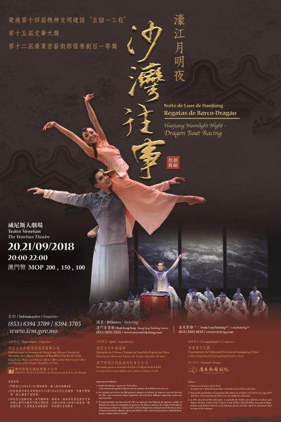 A fim de celebrar o Festival da Lua, o Instituto Cultural apresenta o bailado Noite de Luar de Haojiang – Regatas de Barco-Dragão nos dias 20 e 21 de Setembro, pelas 20:00 horas, no The Venetian Theatre. Este bailado é organizado conjuntamente pelo Gabinete para os Assuntos de Hong Kong, Macau e Taiwan do Ministério da Cultura e Turismo da RPC e pelo Instituto Cultural do Governo da R.A.E. de Macau, contando com o apoio do Ministério da Cultura e Turismo da RPC e da Secretaria para os Assuntos Sociais e Cultura da RAEM, e ainda com a co-organização do Departamento Cultural da Província de Guangdong. Os bilhetes encontram-se à venda a partir de Domingo (dia 19 de Agosto) na Bilheteira Online de Macau.