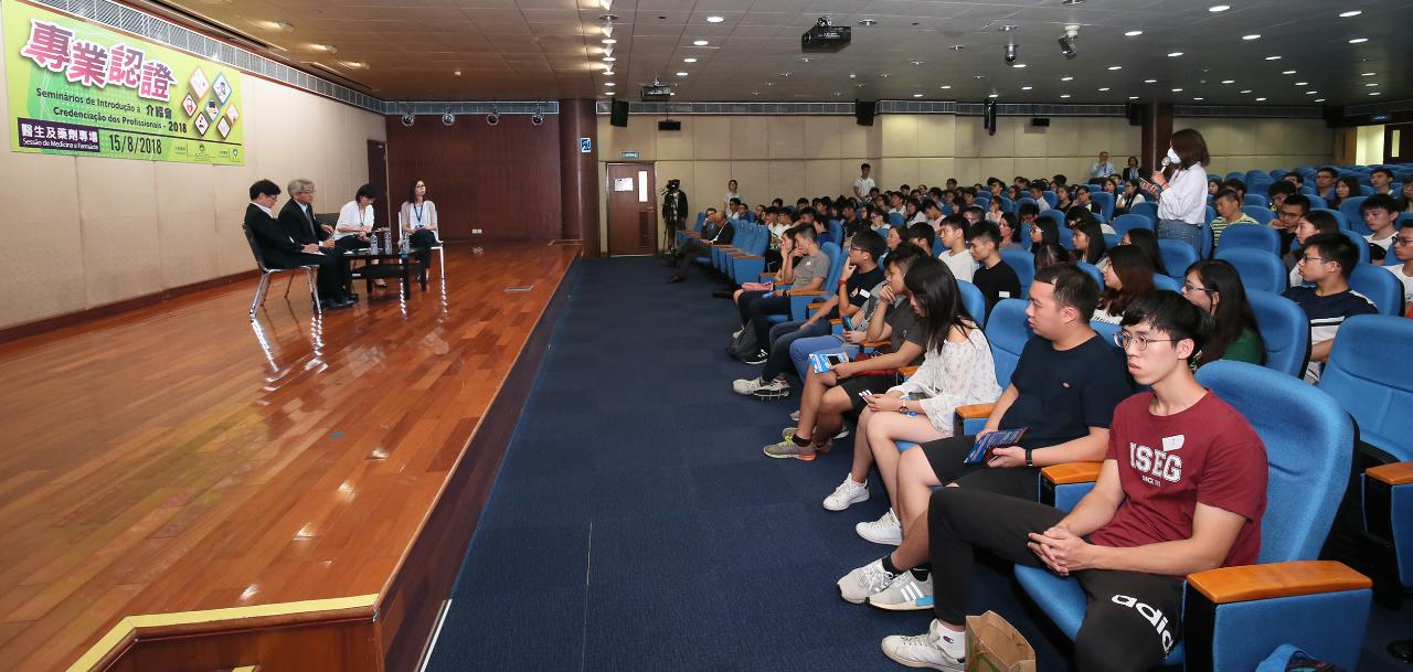 Organizado pelo Gabinete de Apoio ao Ensino Superior e co-organizado pelos Serviços de Saúde, o “Seminário de Introdução à Credenciação dos Profissionais - 2018 - Sessão de Medicina e Farmácia” foi realizado no Centro de Saúde da Areia Preta em 15 de Agosto, onde estiveram presentes cerca de 130 estudantes universitários. Participaram também na iniciativa o Director dos Serviços de Saúde, Dr. Lei Chin Ion, o Chefe do Departamento de Assuntos Farmacêuticos, Choi Peng Cheong, a Responsável da Unidade Técnica de Licenciamento das Actividades e Profissões Privadas de Prestação de Cuidados de Saúde, Leong Pui San, o Coordenador Substituto do Gabinete de Apoio ao Ensino Superior, Chang Kun Hong, e o Vice-Coordenador Substituto, Chan Ka Hou.
