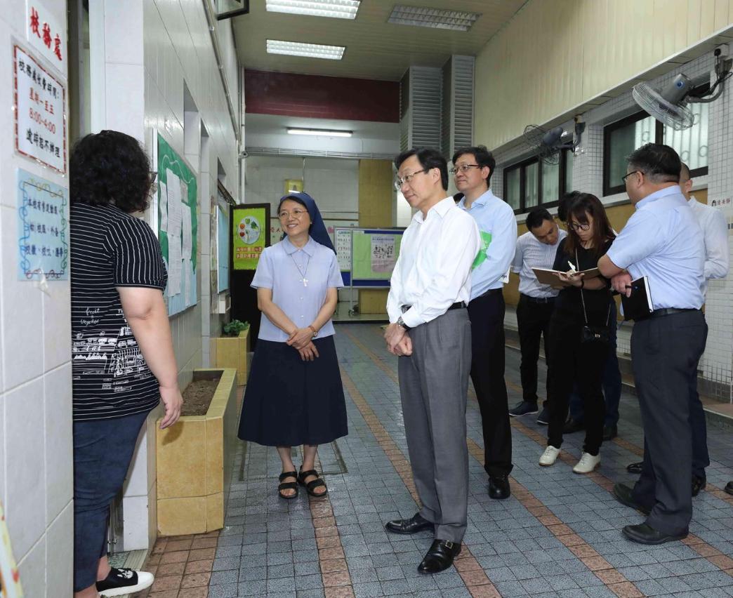 O Secretário para os Assuntos Sociais e Cultura, Alexis Tam, acompanhado pelo director da Direcção dos Serviços de Educação e Juventude (DSEJ), Lou Pak Sang, subdirector substituto da DSEJ, Kong Ngai, e várias chefias da DSEJ, visitou a Escola Santa Maria Mazzarello e a Escola Secundária Técnico-Profissional da Associação Geral Dos Operários para se inteirar do prejuízo causado pelo tufão “Mangkhut”, das dificuldade que as escolas estão a enfrentar e dos preparativos realizados para o regresso às escolas.