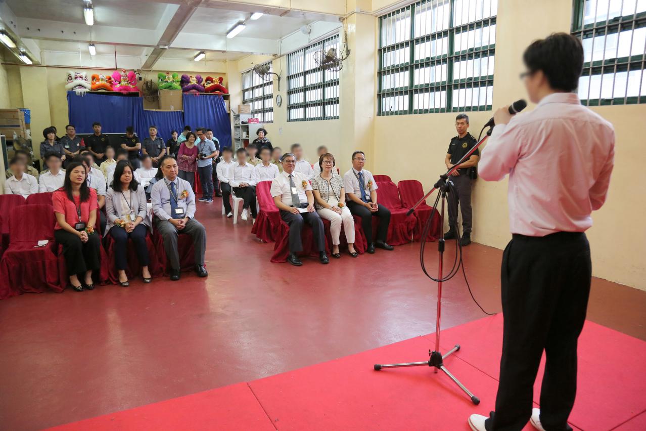 Estiveram presentes no evento, os convidados: o Director e a Subdirectora da Escola Secundária Luso-Chinesa de Luís Gonzaga Gomes – Leong Iao Cheng e Ieong Weng Si, o Director do Estabelecimento Prisional de Coloane – Ng Ioi On, o Chefe da Divisão de Segurança e Vigilância – Lam Kam Sau, a Chefe da Divisão de Apoio Social, Educação e Formação – Ho Sio Mei. No discurso, o Director Leong Iao Cheng disse que estava satisfeito com o facto de os reclusos terem alcançado excelentes resultados, encorajando os mesmos a esforçarem-se nos estudos para alcançarem mais sucesso. Após a atribuição dos certificados, o representante dos reclusos partilhou as experiências da aprendizagem, apresentando os sinceros agradecimentos aos professores e técnicos sociais pelo apoio prestado.