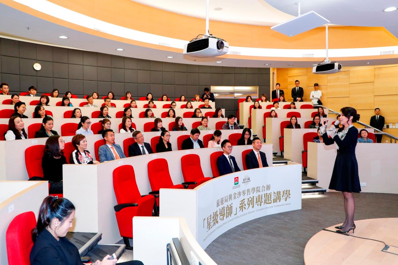 Intitulado “Marca Pessoal”, o workshop decorreu esta manhã no Centro Adelson de Educação Avançada. A oradora convidada partilhou com os participantes a sua experiência em obter oportunidades de auto-aperfeiçoamento contínuo no meio artístico para alcançar o objectivo de uma transformação profissional com sucesso. O seu lema de sucesso é “Fazer seriamente o trabalho actual, planeando o caminho para, pelo menos, os cinco anos seguintes. Não desistir de perseguir os seus sonhos seja em que idade for, porque a criação duma marca pessoal fica para sempre.” Os perto de 100 profissionais de venda a retalho participantes no workshop, principalmente de lojas de luxo e lojas alugadas de grandes centros comerciais, mostraram muito interesse no conteúdo, ouvindo atentamente e participando de forma activa na acção de formação.