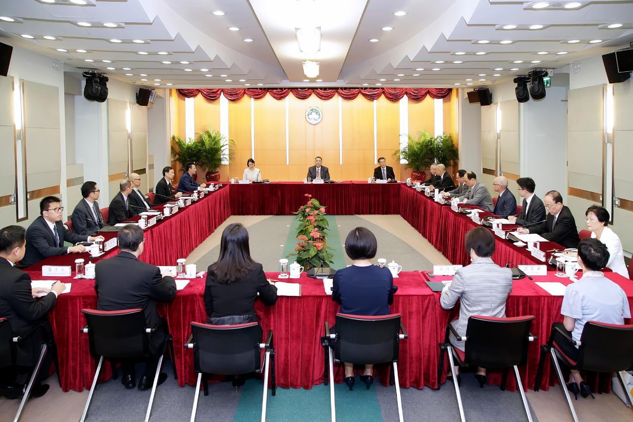 O Chefe do Executivo, Chui Sai On, reuniu-se, hoje (15 de Outubro), na Sede Governo, com os representantes da Associação Económica de Macau e do Centro de Pesquisa Estratégica para o Desenvolvimento de Macau, trocando impressões sobre o ambiente macroeconómico, a construção da Grande Baía Guangdong-Hong Kong-Macau e vários temas sociais e ligados ao quotidiano da população, no âmbito da elaboração das Linhas de Acção Governativa para o ano de 2019.