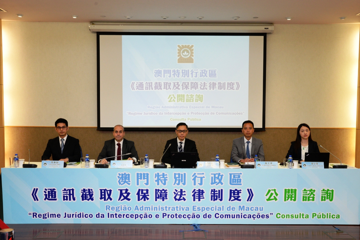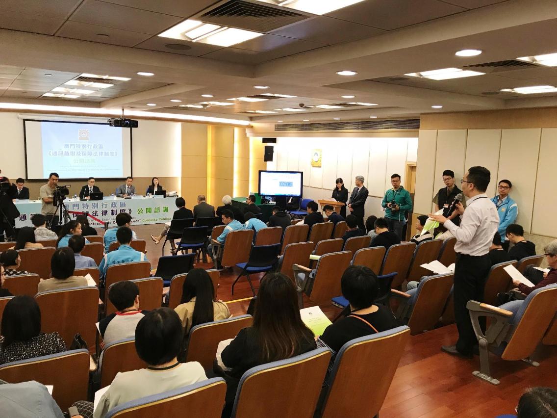 O Governo da RAEM realizou a 1.ª sessão de consulta pública destinada à população sobre o Regime Jurídico da Intercepção e Protecção de Comunicações, no dia 20 de Outubro, pelas 15H00, na sede da Polícia Judiciária. Mais de 80 cidadãos participaram nesta sessão de consulta, entre os quais, 11 pessoas expressaram as suas opiniões.