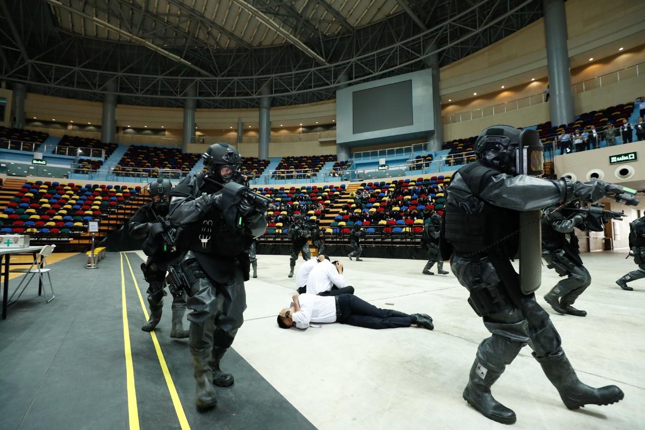 Os Serviços de Polícia Unitários (SPU) e a Guarnição em Macau do Exército de Libertação do Povo Chinês (adiante designada por “Guarnição em Macau”), em coordenação com os Serviços de Alfândega (SA), Corpo de Polícia de Segurança Pública (CPSP), Polícia Judiciária (PJ), Corpo de Bombeiros (CB), Serviços de Saúde (SS), Gabinete de Comunicação Social e Instituto do Desporto, realizaram hoje à tarde, na Nave Desportiva dos Jogos da Ásia Oriental de Macau, um exercício conjunto antiterrorista denominado “Cão espirituoso”, com o objectivo de reforçar o mecanismo de acção conjunta e elevar a capacidade de resposta a ocorrências súbitas. O exercício decorreu sem sobressaltos, terminou com sucesso e alcançou os resultados previstos.