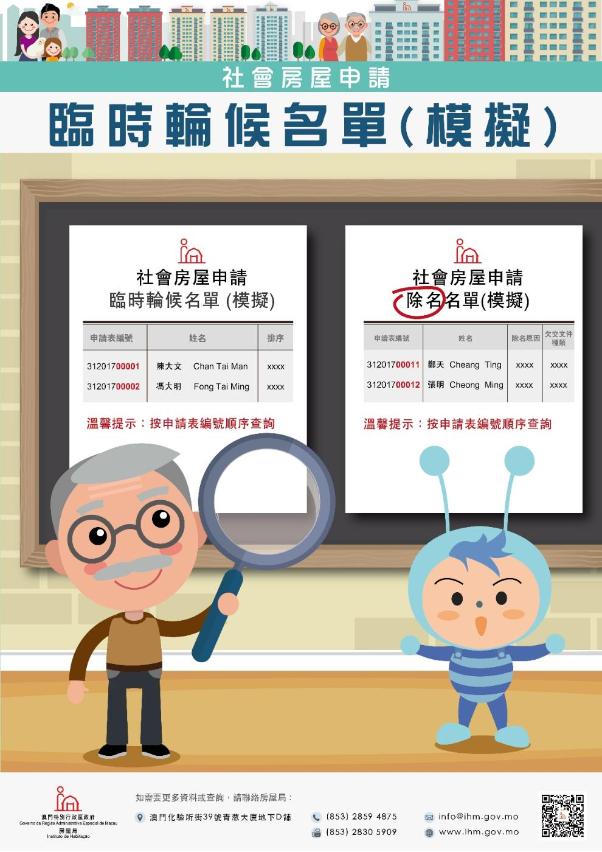 Os candidatos ainda conseguem consultar através da página electrónica do IH (www.ihm.gov.mo), na coluna de Consulta a ordenação da habitação social, podendo escolher através da inserção do número do boletim de candidatura ou do primeiro sete números do bilhete de identidade do representante do agregado familiar, para consultar a ordenação da candidatura ou o motivo da exclusão.