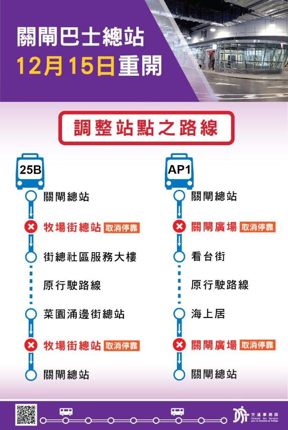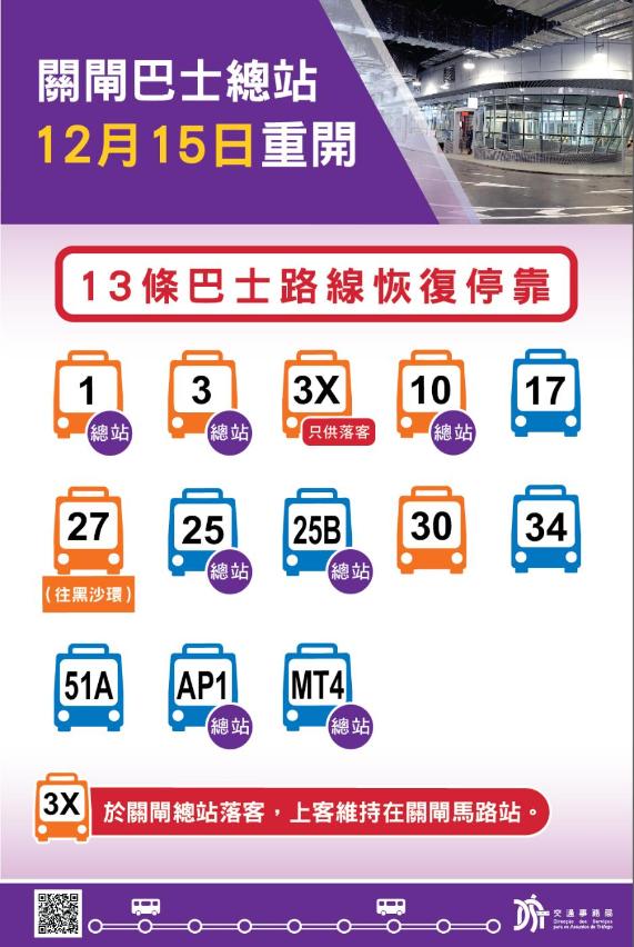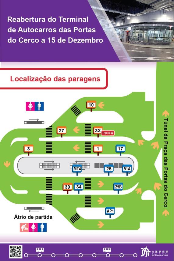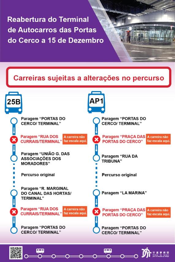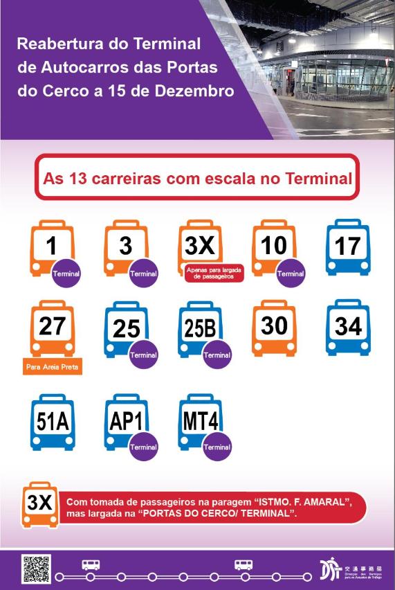 O terminal subterrâneo de autocarros da Praça das Portas do Cerco vai reabrir a 15 de Dezembro (sábado). Na fase inicial, um total de 13 carreiras de autocarros fazem escala no terminal e as restantes mantêm-se a funcionar de acordo com a disposição actual. A Direcção dos Serviços para os Assuntos de Tráfego apela ao público que preste atenção à situação. Entretanto, a DSAT vai acompanhar de forma contínua a situação do funcionamento do terminal e das carreiras, para além de proceder à recolha de opiniões no sentido de ajustar atempadamente a disposição das carreiras.