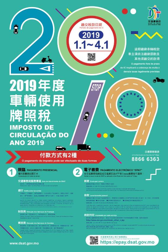 A Direcção dos Serviços para os Assuntos de Tráfego (DSAT) informa os titulares de veículos que o imposto de circulação de 2019 será cobrado entre 1 de Janeiro a 1 de Abril. Para efectuar o pagamento, os cidadãos devem dirigir-se a um dos locais disponíveis, designadamente, Área de Atendimento da DSAT, edifício ou centro de atendimento da Direcção dos Serviços de Finanças, estação central, estações determinadas da Direcção dos Serviços de Correios e Loja do Museu das Comunicações e 9 instituições bancárias de Macau-mais de 130 sedes e sucursais (vide no Anexo I), munido do original do livrete do veículo para pagar o imposto. Os cidadãos podem ainda optar pelo pagamento electrónico da DSAT (https://epay.dsat.gov.mo). A DSAT adverte os proprietários de veículos que devem liquidar as multas de infracções antes de efectuar o pagamento do imposto.