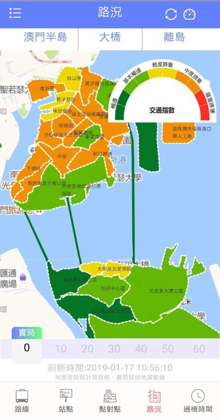 A função de visualização em tempo real e previsão do estado de tráfego rodoviário consiste em duas partes: 1) Visualização em tempo real e previsão do estado de tráfego das diversas zonas, podendo os utilizadores, através desta função, consultar o estado em tempo real do tráfego das zonas e prever a situação rodoviária até à próxima hora; 2) Visualização em tempo real e previsão da situação rodoviária, podendo os utilizadores consultar em tempo real e prever a situação até à próxima hora de todas as vias de categoria A de Macau. Além disso, para permitir aos cidadãos melhor entender a situação rodoviária, a mesma passa a ser classificada em cinco categorias, em vez de duas categorias iniciais, i.e. “fluxo desimpedido”, “fluxo basicamente desimpedido”, “congestionamento ligeiro”, “congestionamento médio” e “congestionamento grave”.