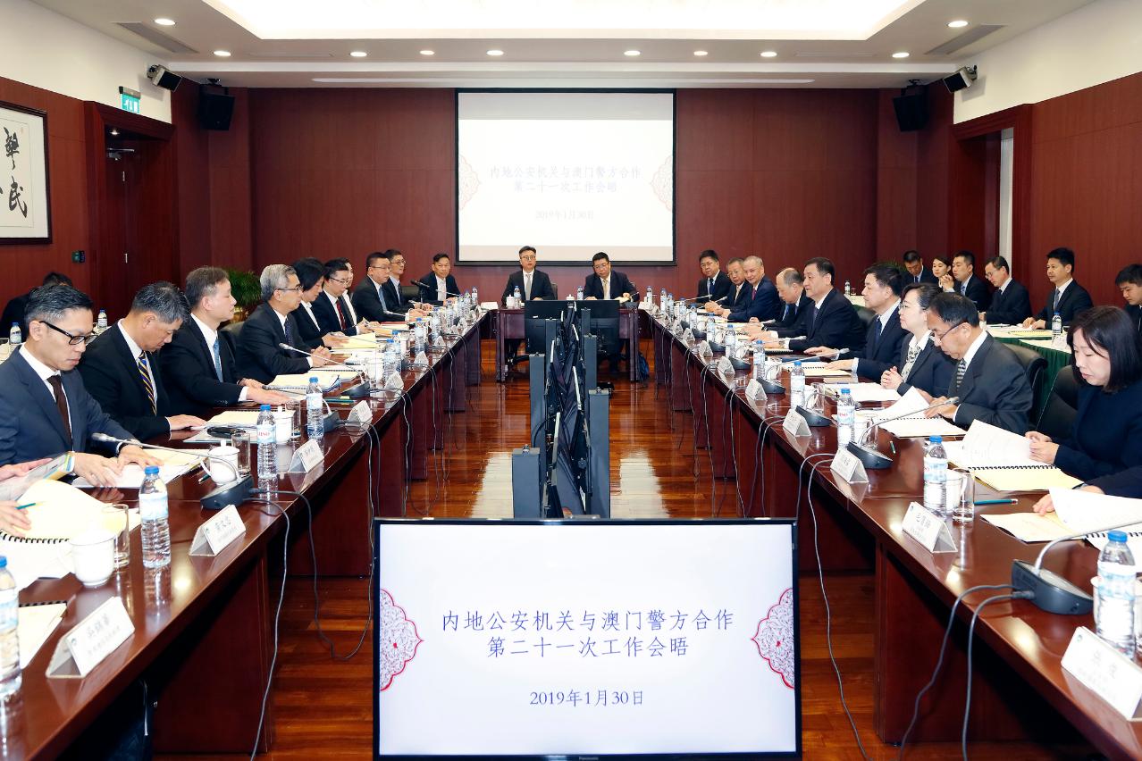 Hoje (30 de Janeiro de 2019), o Secretário para a Segurança, Wong Sio Chak e o Vice-ministro permanente do Ministério da Segurança Pública da China, Wang Xiaohong, lideraram as respectivas delegações a participarem no “21.º Encontro de Trabalho sobre a Cooperação entre os Órgãos de Segurança Pública do Interior da China e as Autoridades Policiais de Macau”, que teve lugar em Macau. Ambas as partes trocaram informações e apresentaram os seus balanços sobre a situação da segurança do ano transacto e das acções de cooperação policial, bem como abordaram assuntos relativos à implementação de trabalhos policiais no âmbito das actividades comemorativas do 70.º aniversário da fundação da RPC e do 20.º aniversário do retorno de Macau à Pátria e, bem assim, o reforço de cooperação em diversas áreas.