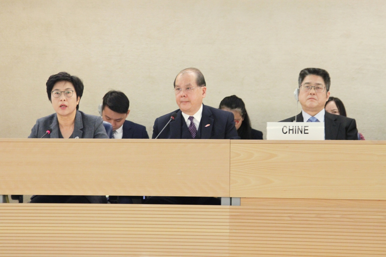 Em 15 de Março de 2019, o Conselho dos Direitos do Homem das Nações Unidas adoptou tranquilamente o 3.º relatório do Exame Periódico Universal da China. O Governo Chinês atribui uma grande importância à avaliação em causa, tendo a Delegação da China sido chefiada ao mais alto nível pelo Vice-Ministro do Ministério dos Negócios Estrangeiros, Dr. Le Yucheng, incluindo ainda três subchefes da Delegação, a saber: o representante permanente da China em Genebra, Dr. Yu Jianhua, o Secretário para a Região Administrativa Especial de Hong Kong, Dr. Matthew Cheung Kin-chung e a Secretária para a Administração e Justiça da Região Administrativa Especial de Macau (RAEM), Dra. Sónia Chan.