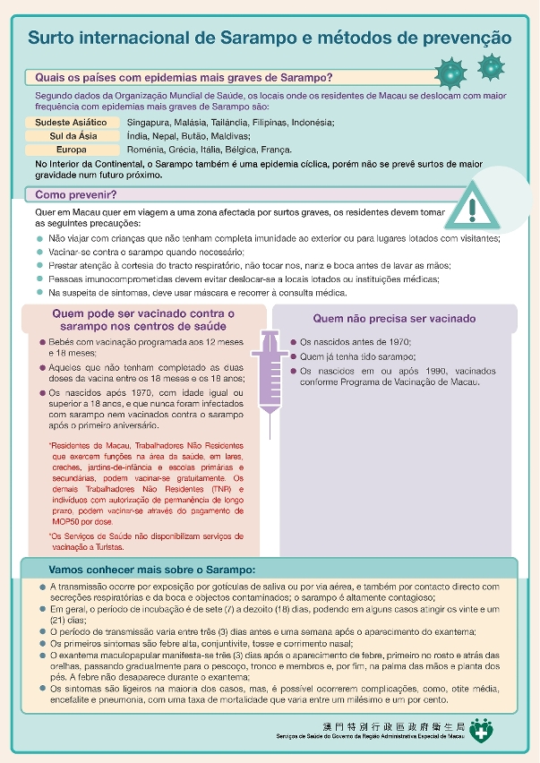 O Director dos Serviços de Saúde, a propósito, salientou que desde 2014 a Região Administrativa Especial de Macau passou a ser um dos quatro países e regiões do Pacífico Ocidental que são certificados com o titulo de região onde o Sarampo está erradicado, contudo este titulo não significa que não possam ser detectados casos, já que existem epidemias de sarampo em várias zonas do mundo, incluindo o Interior da China, sudeste da Ásia, sul da Ásia e Europa.