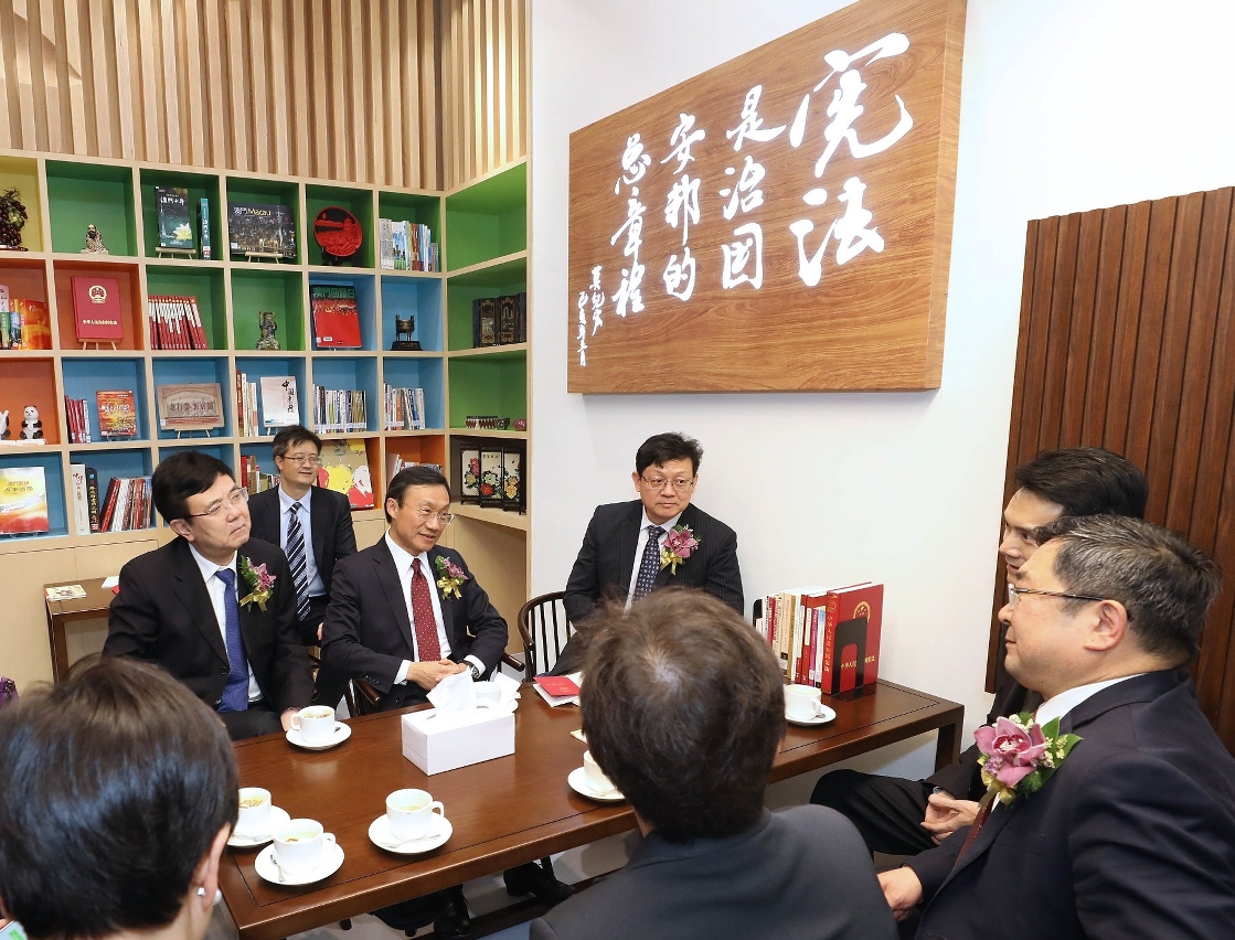 A cerimónia contou com a presença dos seguintes convidados: Secretário para os Assuntos Sociais e Cultura, Dr. Alexis Tam, Subdirector do Gabinete de Ligação do Governo Popular Central da RPC na RAEM, Xue Xiaofeng, Chefe do Gabinete de Estudos das Políticas do Comissariado do Ministério dos Negócios Estrangeiros da RPC na RAEM, Conselheiro Ran Bo, Chefe do Gabinete da Guarnição em Macau do Exército de Libertação do Povo Chinês, Coronel Peng Wei, Director da DSEJ, Lou Pak Sang, Directora do Departamento de Educação e Trabalhos Juvenis do Gabinete de Ligação do Governo Popular Central na RAEM, Xu Ting, Presidente do Instituto de Estudos em Direito Internacional da Academia de Ciências Sociais da China, Mo Jihong, Subdirectores da DSEJ, Leong Vai Kei e Kong Chi Meng, vogais do Conselho de Educação para o Ensino Não Superior e do Conselho de Juventude, representantes de associações, entre outras individualidades.