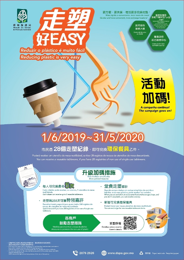 A actividade “A vida sem plástico é muito fácil” foi muito bem acolhida desde o seu lançamento no final do ano anterior. Com o intuito de estimular, de forma contínua, a redução de resíduos a partir da fonte e a diminuição do uso de utensílios de mesa descartáveis, a Direcção dos Serviços de Protecção Ambiental (DSPA) promove a nova fase da actividade intitulada “A vida sem plástico é muito fácil”. O período da actividade decorre entre 1 de Junho do corrente ano e 31 de Maio de 2020. Nesta actividade, para além do aumento dos locais para troca de utensílios de mesa ecológicos, também são reforçadas as diversas medidas de incentivo para evitar o consumo de plástico.