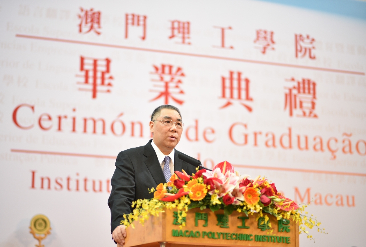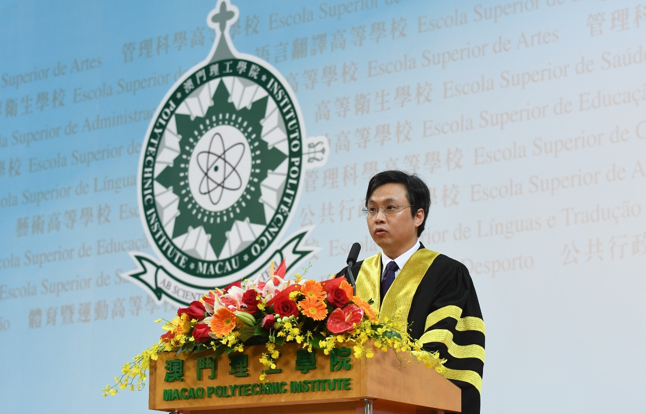 No seu discurso, o Chefe do Executivo da RAEM, Doutor Fernando Chui Sai On, frisou que o Governo da RAEM tem como estratégia de desenvolvimento “Promover a prosperidade de Macau através da educação” e “Construir Macau mediante a formação de talentos“, esforçando-se pelo desenvolvimento equilibrado da educação para promover o desenvolvimento de educação para todos, beneficiando os cidadãos e impulsionando a igualdade social e aproveitando a oportunidade da entrada em vigor do novo “Regime de Ensino Superior de Macau” para impulsionar o desenvolvimento do ensino superior rumo a uma nova era. Concluiu que “Assim, o Governo da RAEM estimula as instituições de ensino superior locais a inovar e a tirar partido das suas próprias especificidades e vantagens no domínio do ensino; a promover a ligação da pesquisa universidade-indústria, a melhorar a capacidade de inovação na área das ciências e tecnologias; a preparar mais quadros qualificados que ajudem a diversificação económica; a optimizar permanentemente as suas instalações pedagógicas e o ambiente de ensino; a reforçar a formação docente, assim assegurando a melhoria contínua da qualidade pedagógica. O Governo da RAEM continua a apoiar o IPM a desenvolver a sua missão privilegiada na formação de talentos aplicados, a oferecer, de acordo com a lei e de forma aplicada, novos cursos de mestrado e doutoramento, a realizar a investigação interdisciplinar, contribuindo assim para desenvolver Macau como base de formação de talentos bilingues que possam ter um papel chinês-português e acelerando a construção de “um centro e uma plataforma” (um centro mundial de turismo e lazer, e uma plataforma de comunicação entre a China e os Países Lusófonos), bem como apoiando a preparação de mais talentos que possam ter um papel activo na implementação das estratégias nacionais “Uma Faixa, Uma Rota” e “Grande Baía de Guangdong – Hong Kong – Macau”. No seu discurso, o Chefe do Executivo da RAEM estimulou os alunos graduados e jovens a desenvolverem-se a par do desenvolvimento de Macau rumo a uma nova fase, e do desenvolvimento da Pátria rumo a uma nova era,” afirmando que: “Vós, como uma nova geração que se encontra numa nova era de desenvolvimento, progredireis a par do desenvolvimento tanto da Pátria, como de Macau. Esta nova era abre-vos mais espaços de crescimento. Desejo sinceramente que todos vocês, neste mundo global, aproveitem bem a vossa juventude e energia, tendo sempre em mente a vossa missão histórica. Atenham-se às vossas crenças, tenham boa saúde e objectivos bem definidos, estudando sempre com diligência, por forma a realizar as vossas aspirações e os vossos sonhos.”