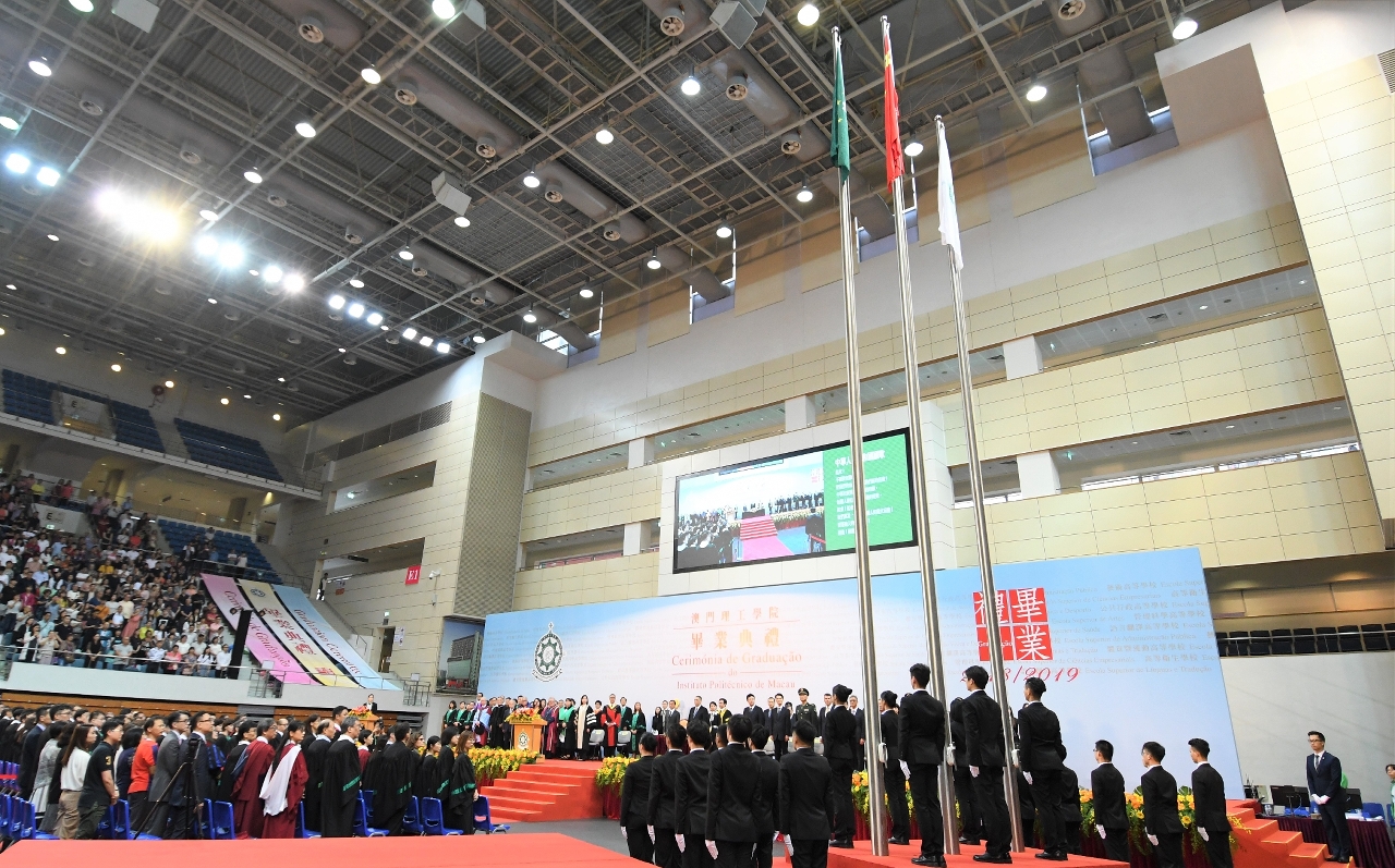 No início do evento realizou-se uma cerimónia solene do hastear da bandeira nacional e da entoação do hino nacional da República Popular da China, actos que o IPM é a única instituição de ensino superior local a realizar, há dois anos consecutivos, na sua Cerimónia de Graduação. Esteve presente neste evento o Doutor Fernando Chui Sai On, Chefe do Executivo da RAEM, acompanhado pelo Doutor Alexis Tam Chon Weng, Secretário para os Assuntos Sociais e Cultura, e o Professor Doutor Marcus Im Sio Kei, Presidente do IPM, que presidiu à cerimónia. Mais de três mil pessoas participaram na Cerimónia de Graduação, de entre as quais se destacam o Sr. Dr. Xue Xiaofeng, Sub-Director do Gabinete de Ligações do Governo Central em Macau; o Sr. Dr. Ran Bo, Chefe do Departamento de Pesquisa de Políticas do Comissariado do Ministério dos Negócios Estrangeiros da República Popular da China na RAEM; o Sr. Zhao Jianning, Chefe do Estado-Maior da Guarnição em Macau, do Exército de Libertação do Povo Chinês; para além dos membros do Conselho Consultivo do IPM; representantes de alguns serviços públicos da RAEM; representantes de algumas empresas de Macau, instituições que atribuem prémios de estudo aos alunos do IPM; e os pais e familiares dos alunos graduados, entre muitas outras pessoas.