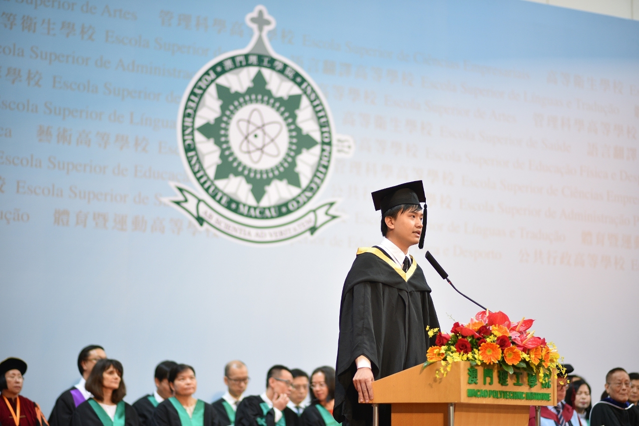 Na cerimónia, o Wong Chong Chon, aluno graduado do Curso de Licenciatura em Administração Pública do IPM, na sua qualidade de representante dos alunos graduados, proferiu também um discurso de agradecimento através no qual apresentou, em nome de todos os alunos graduados, os sinceros agradecimentos ao IPM – universidade mãe, pelas excelentes condições de ensino e aprendizagem que ofereceu; aos professores e aos pais, pela sua confiança, encorajamento e apoio permanente, e ao Governo da RAEM, pela atenção que tem prestado ao longo de muitos anos, não só ao ensino superior, como também aos estudantes, O Wong Chong Chon partilhou a sua sensação de viver e estudar no IPM com os outros alunos, provenientes de diferentes países e regiões, e com diferentes fundos culturais, afirmando que: “Durante este período, vencemos muitas dificuldades e desafios, com esforço e dedicação. Hoje, estamos muito orgulhosos de participar nesta Cerimónia solene, partilhando a nossa alegria e orgulho com os nossos professores e os nossos pais. Com tudo isto, vamos focar-nos na nossa missão histórica servindo melhor a sociedade evitando a soberba e a vaidade, estudando com diligência, aprendendo sempre, lutando para alcançar os nossos sonhos e conquistar brilhantes êxitos para que o IPM, a nossa universidade mãe, se orgulhe de nós.”